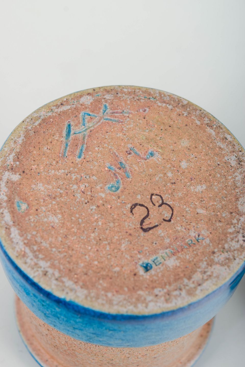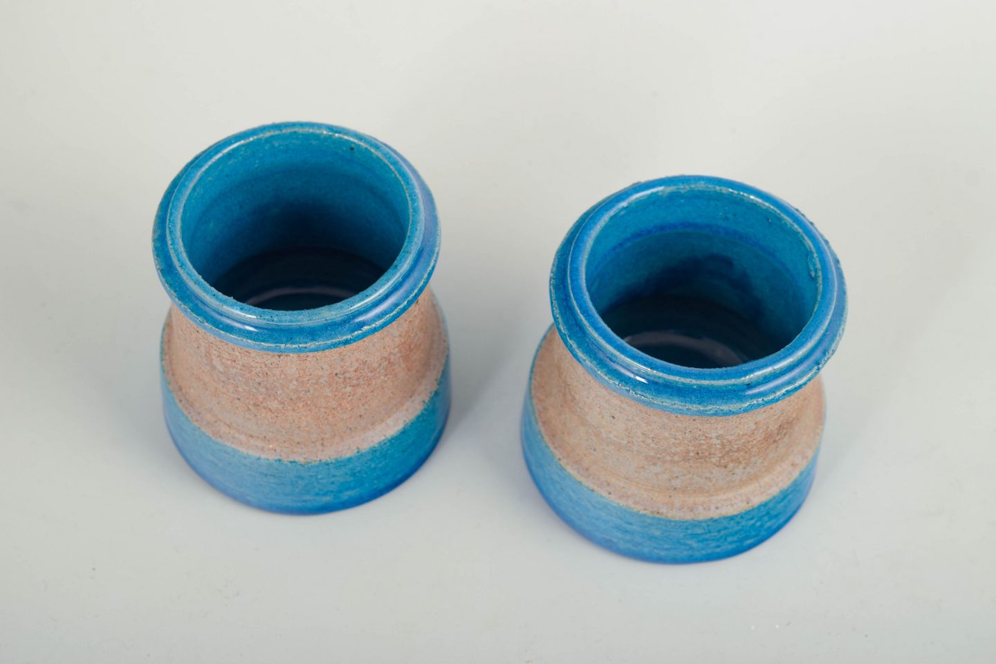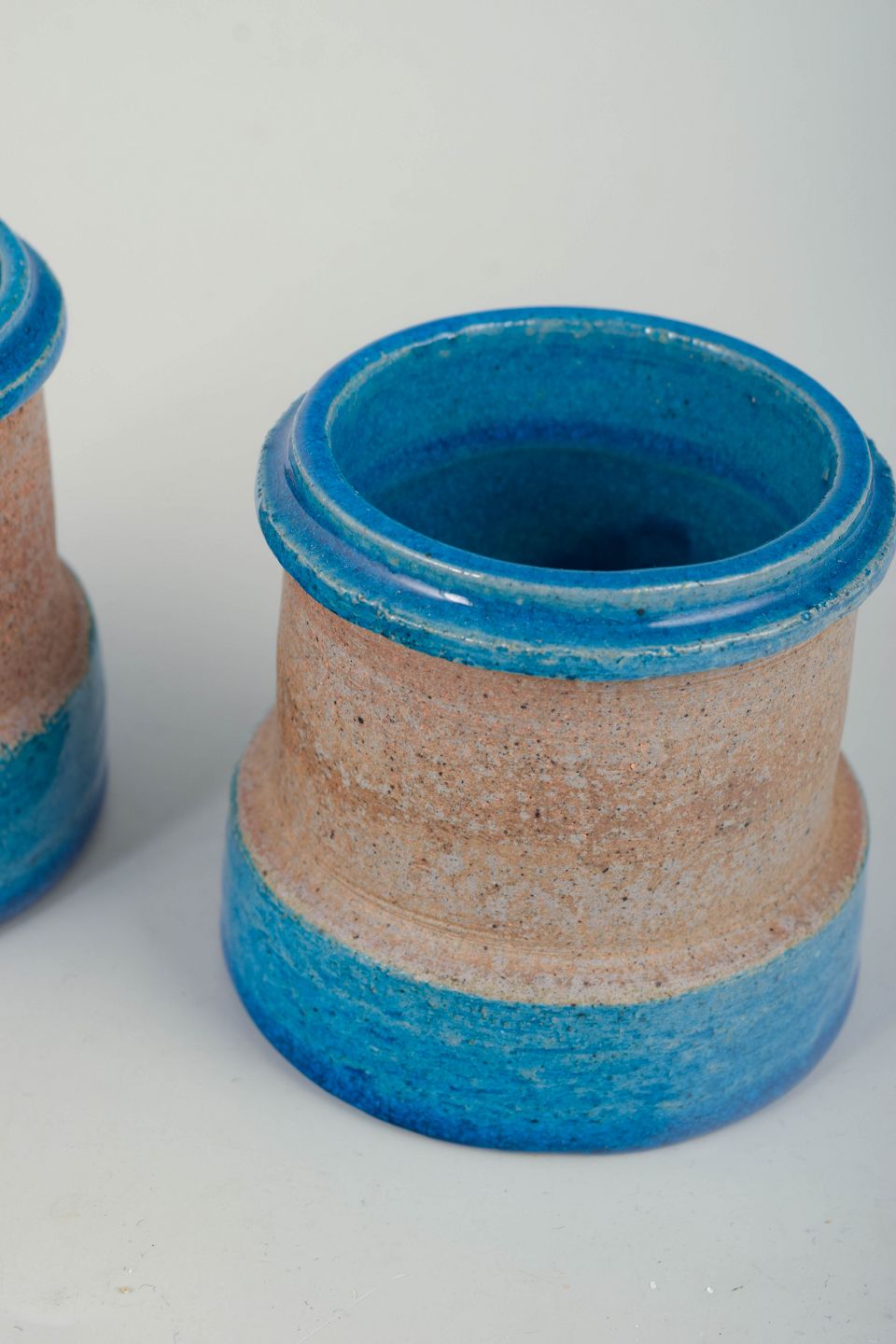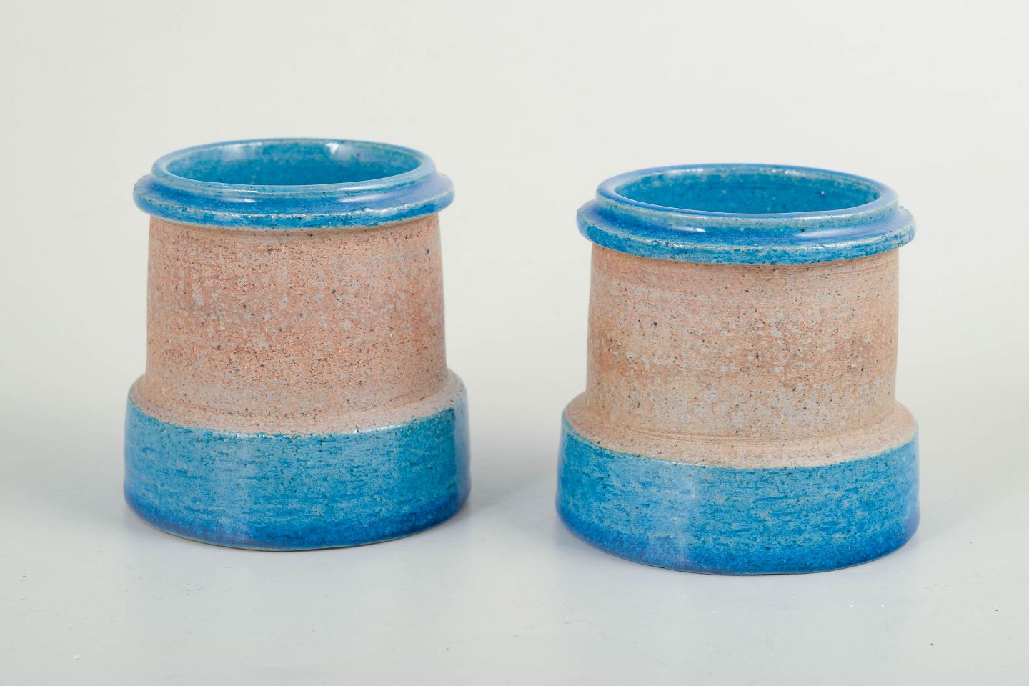 Par små cylindriske vaser i drejet stentøj med blank blå glasur nederst og ved mundingen samt sandfarvet, uglaseret midterparti. Enkle, funktionelle former med tydelig reference til dansk modernisme fra 1960’erne.