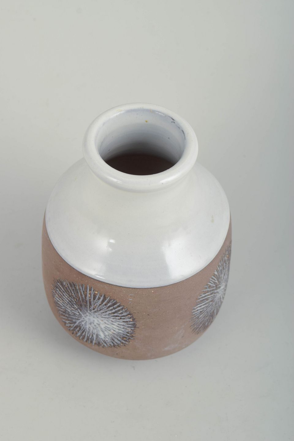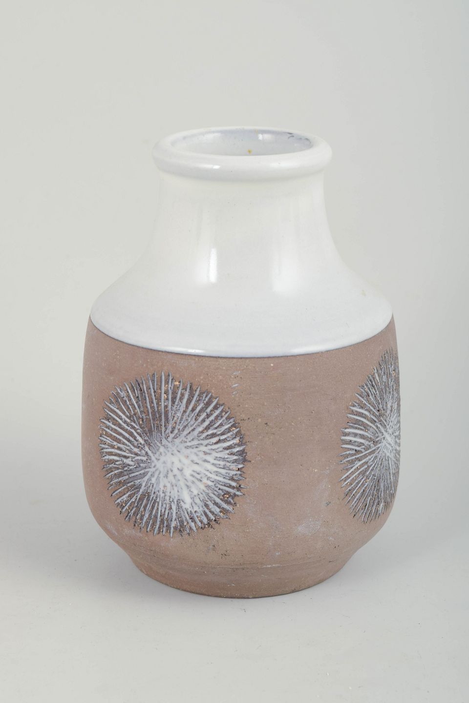 Rundbuget vase i glaseret keramik med kort hals og markant skulder. Underdelen er udført i en varm, brunlig glasur og dekoreret med grafiske, stiliserede blomster- eller strålemotiver i hvid, mens overdelen er afsluttet i blank hvid glasur. Kontrasten mellem de to glasurer giver vasen et klart og balanceret modernistisk udtryk. Modelnummer 3062G.