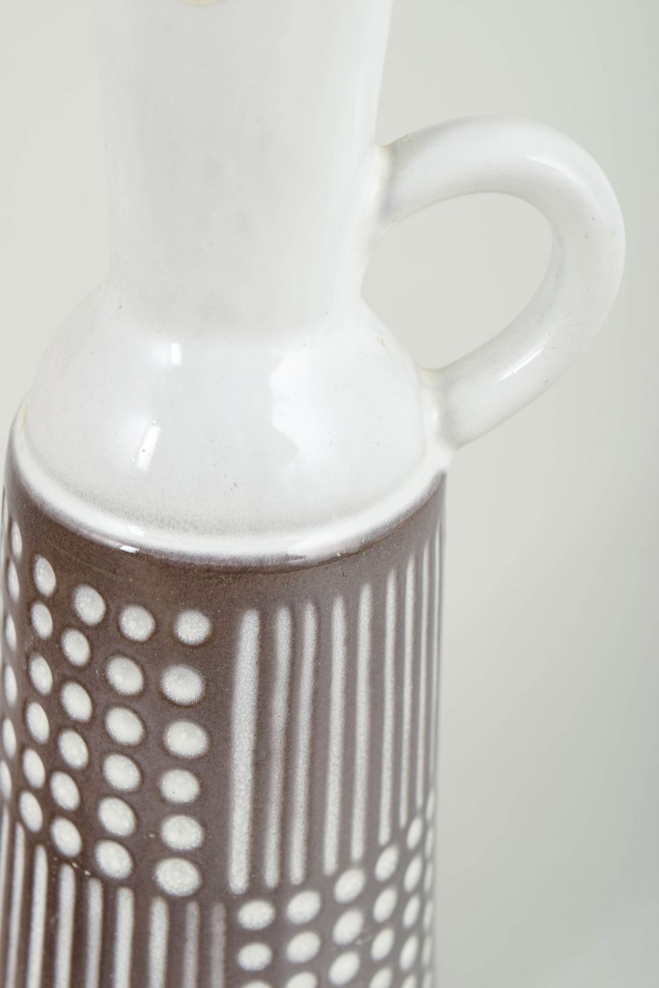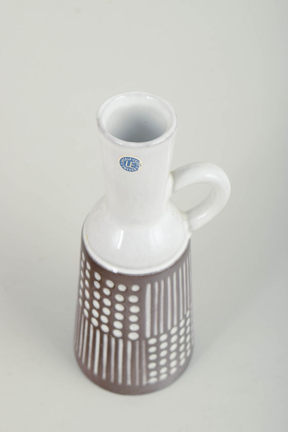 Slank, cylindrisk kande i glaseret keramik med smal hals og enkelt hank. Underdelen er dekoreret med grafiske prik- og stregmønstre i hvid mod brun bundglasur, mens den øvre del er udført i hvid glasur. Dekorationen fremstår stram og rytmisk med et tydeligt modernistisk udtryk. Modelnummer 4563.