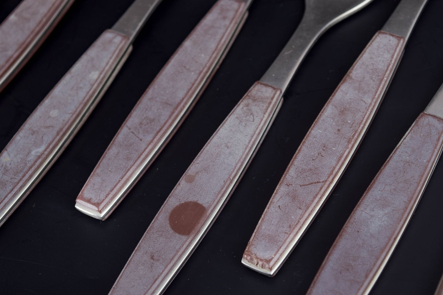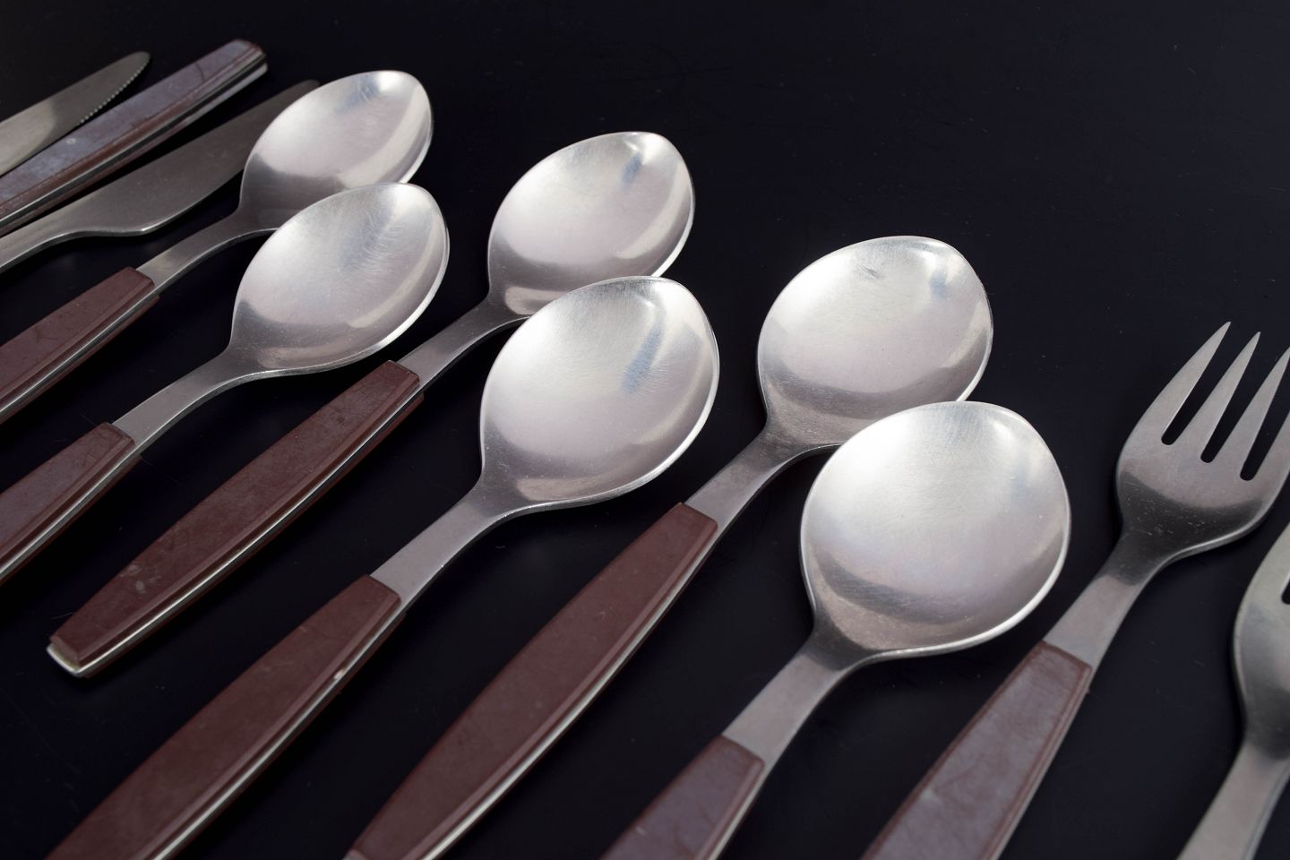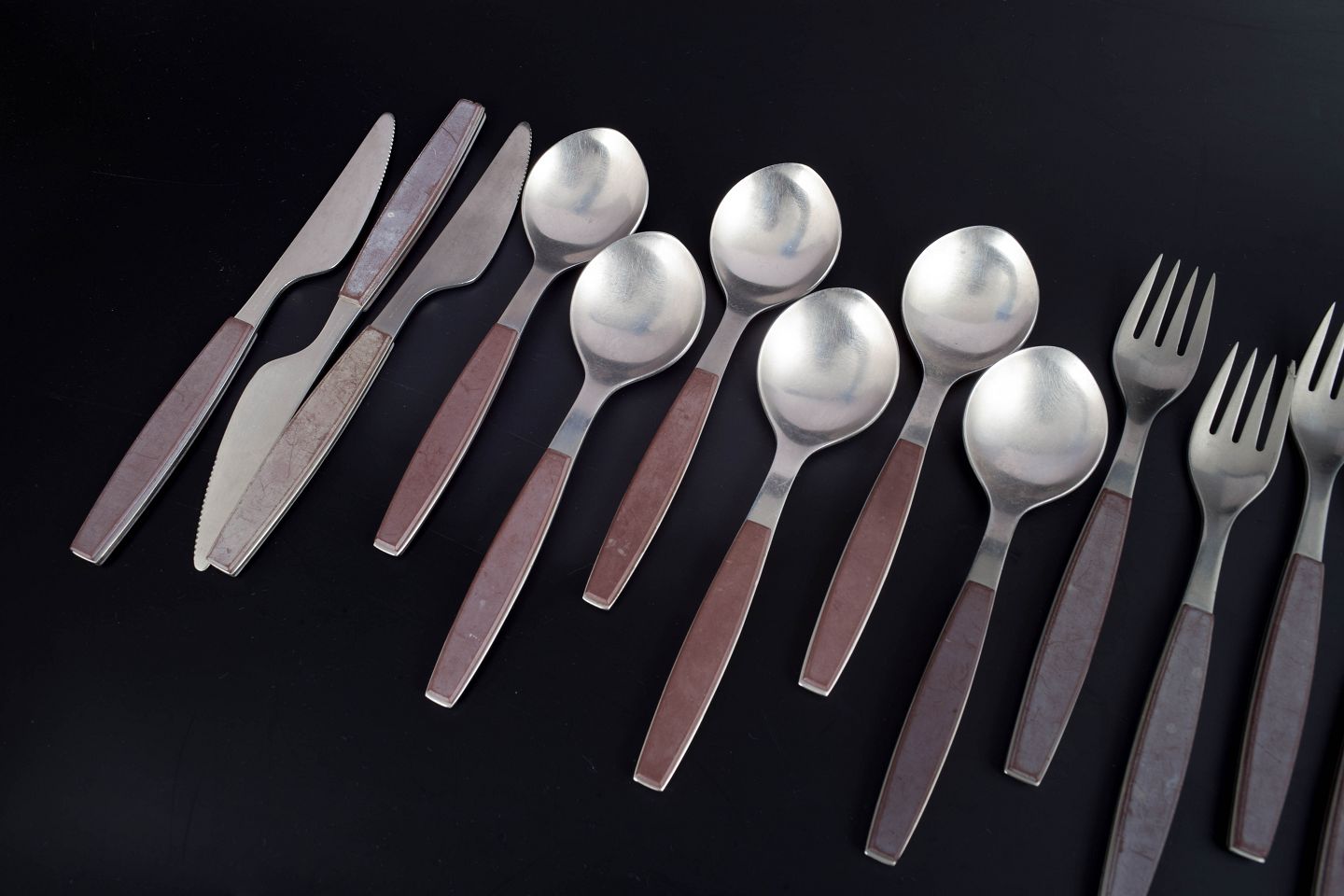 Komplet sæt bestående af seks middagsknive, seks middagsgafler og seks spiseskeer i rustfrit stål med brune håndtag. Modellen er fra Strata-serien.