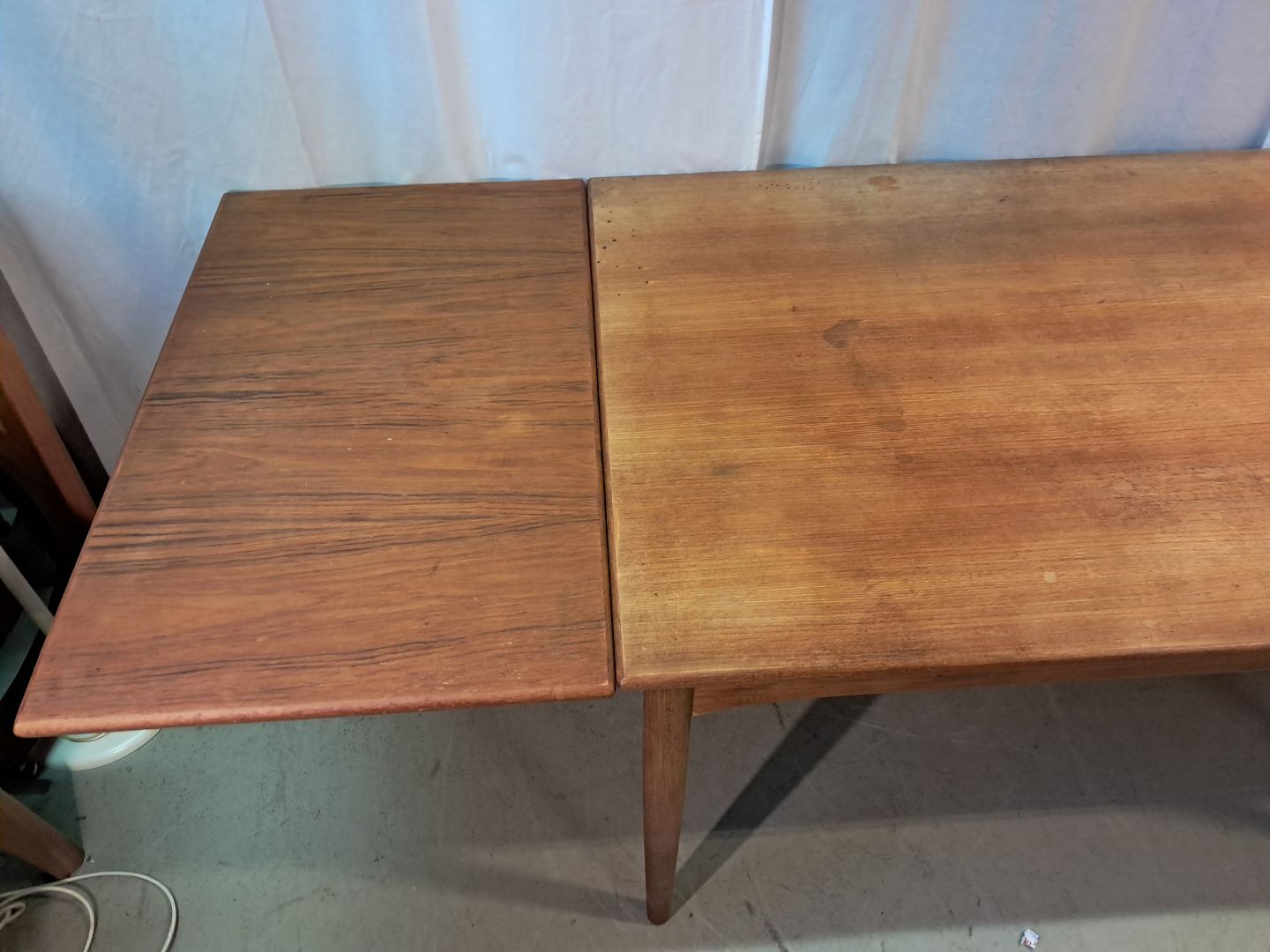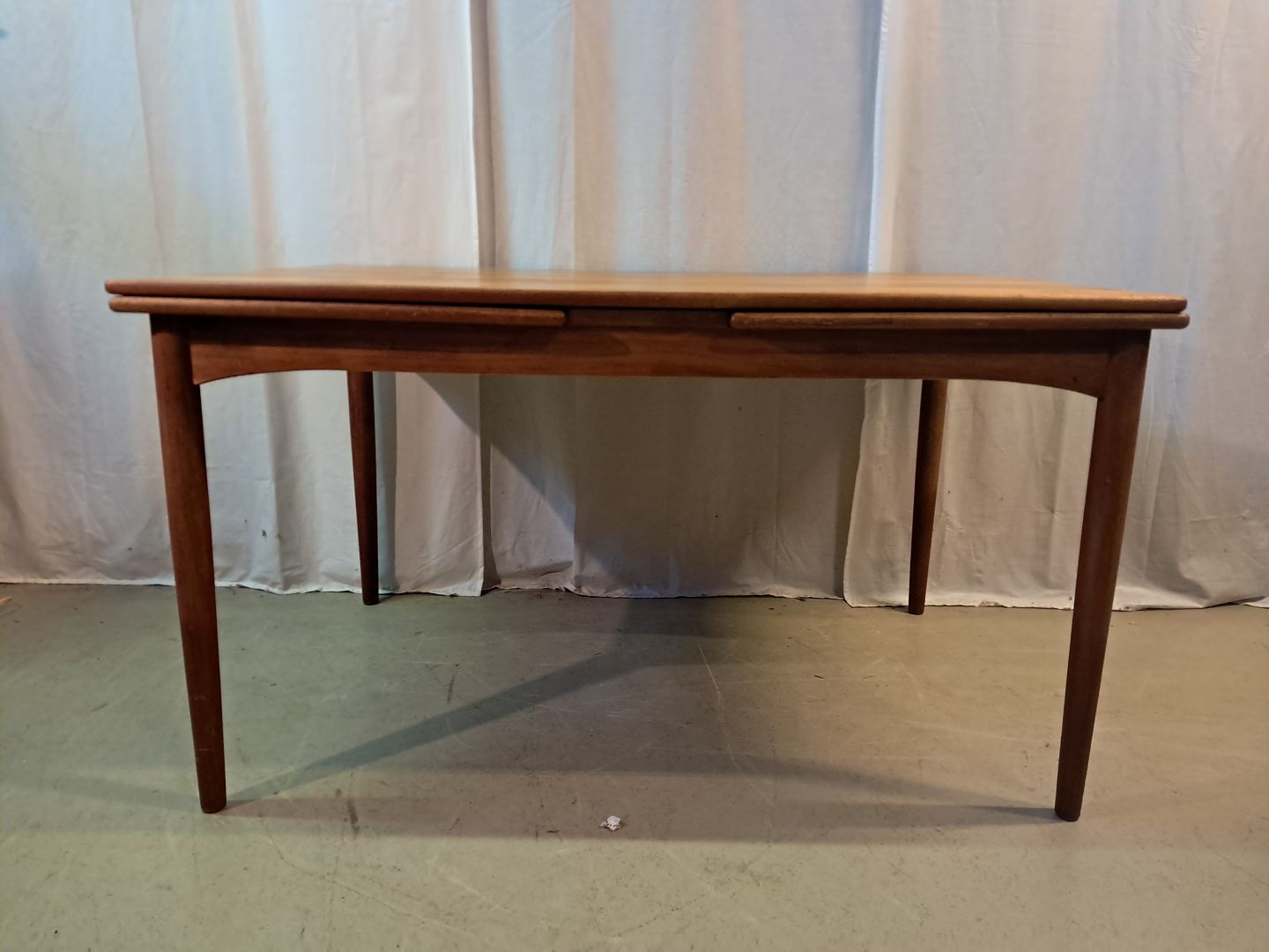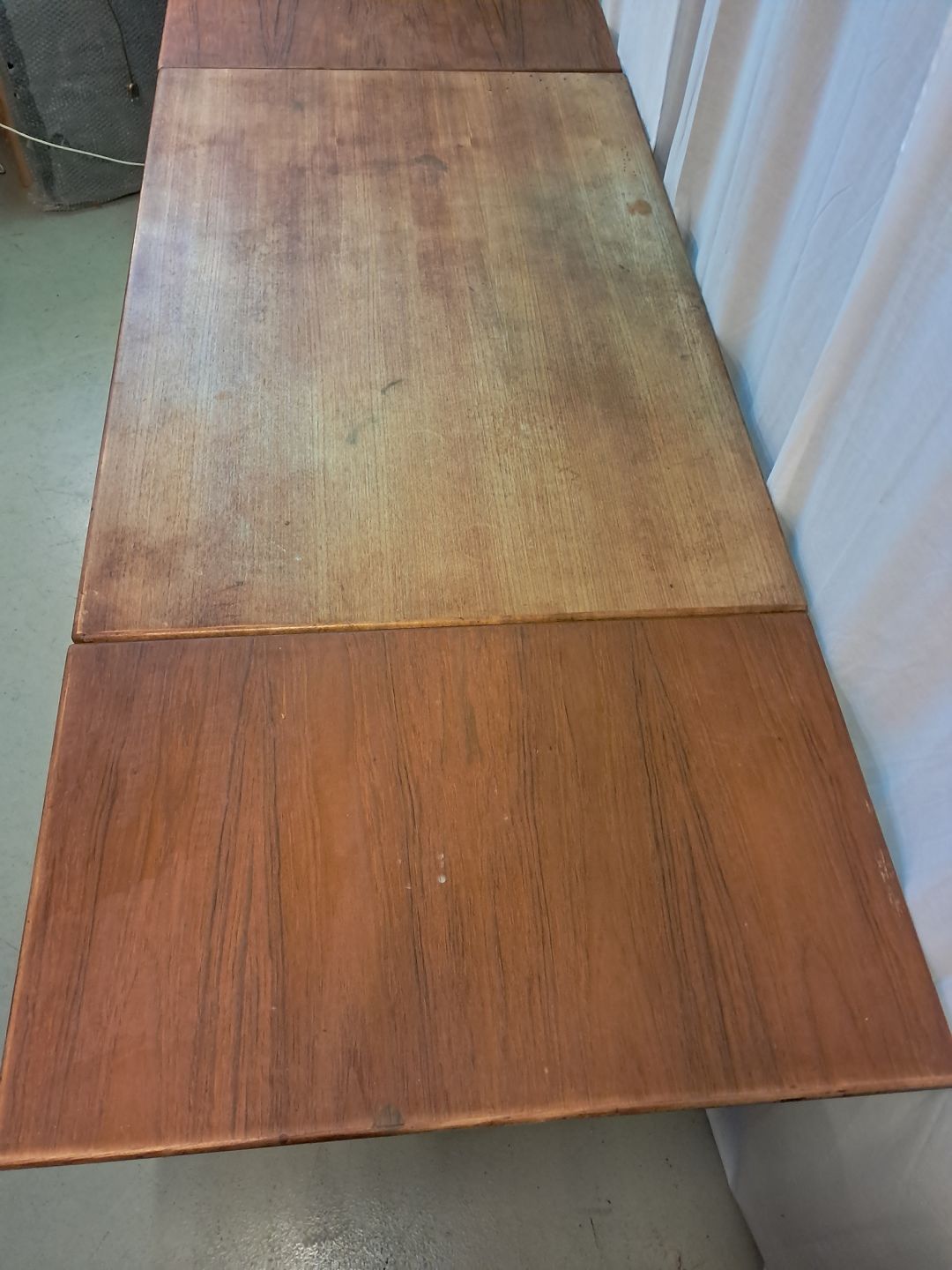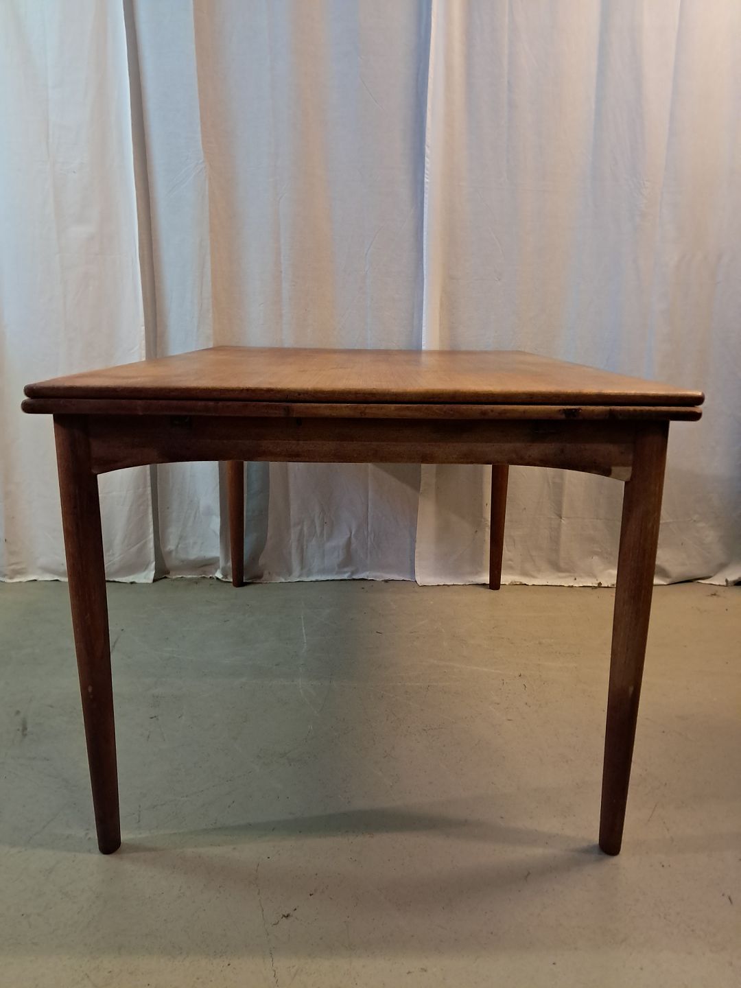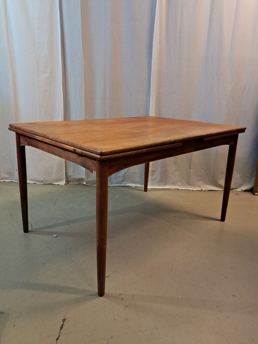 Spisebord i fineret teaktræ med hollandsk udtræk, fra 1960erne.
