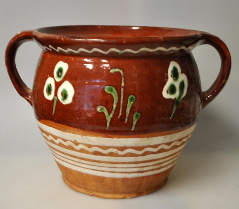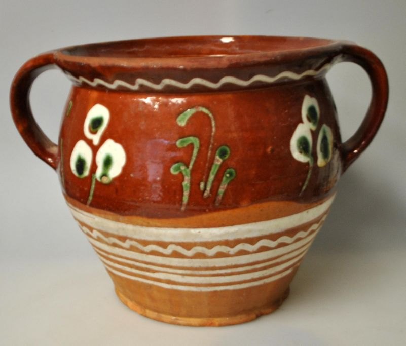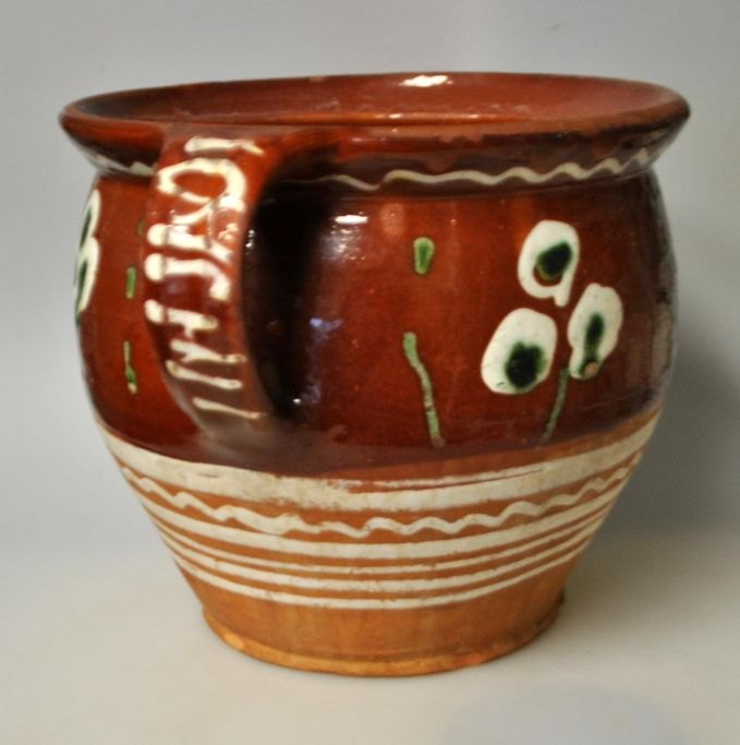 To øret krukke med udvendig brun begitning, Sorring, ca. 1870, Danmark. Dekoreret med blomster og hvide streger. H.: 18 cm. Dia.: 20 cm.