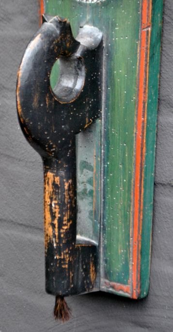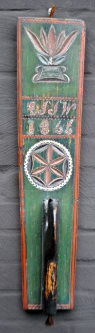 Dansk manglebræt, 19. årh. Bøgetræ. Med hestegreb og karvskæringer. Dateret 1866 og med gravering: ESSW. Grøn- og rødmalet. L.: 61 cm.