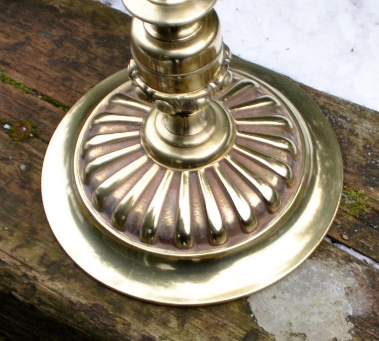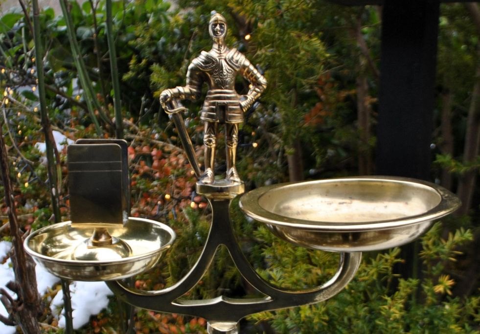 Messingständer mit Aschenbecher und Streichholzhalter, 19. Jahrhundert. Mit doppelt gedrehter Säule und einer Ritterfigur in Rüstung als Abschluss. Auf rundem Fuß. Höhe: 86 cm. Breite: 32 cm.