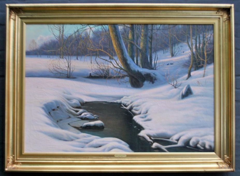 Wang, Albert (1864 - 1930) Danmark: Snelandskab. Olie på lærred. Signeret: A. Wang. H: 67 cm. B: 95 cm.