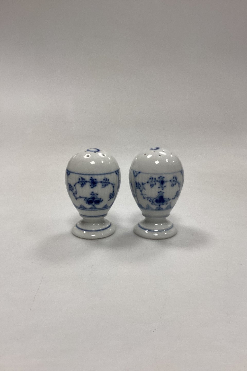Royal Copenhagen Musselmalet Riflet Salt - og Pebersæt No. 189/2009. Måler 7,5 cm / 2.95 in.