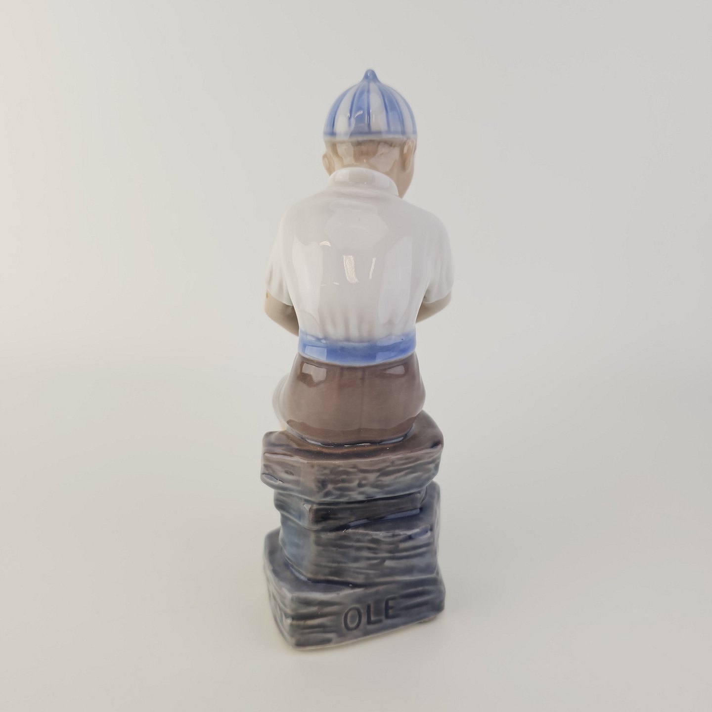 Figur i hvidt porcelæn med motiv af en dreng med navnet Ole i en stribet kasket, som sidder på sten