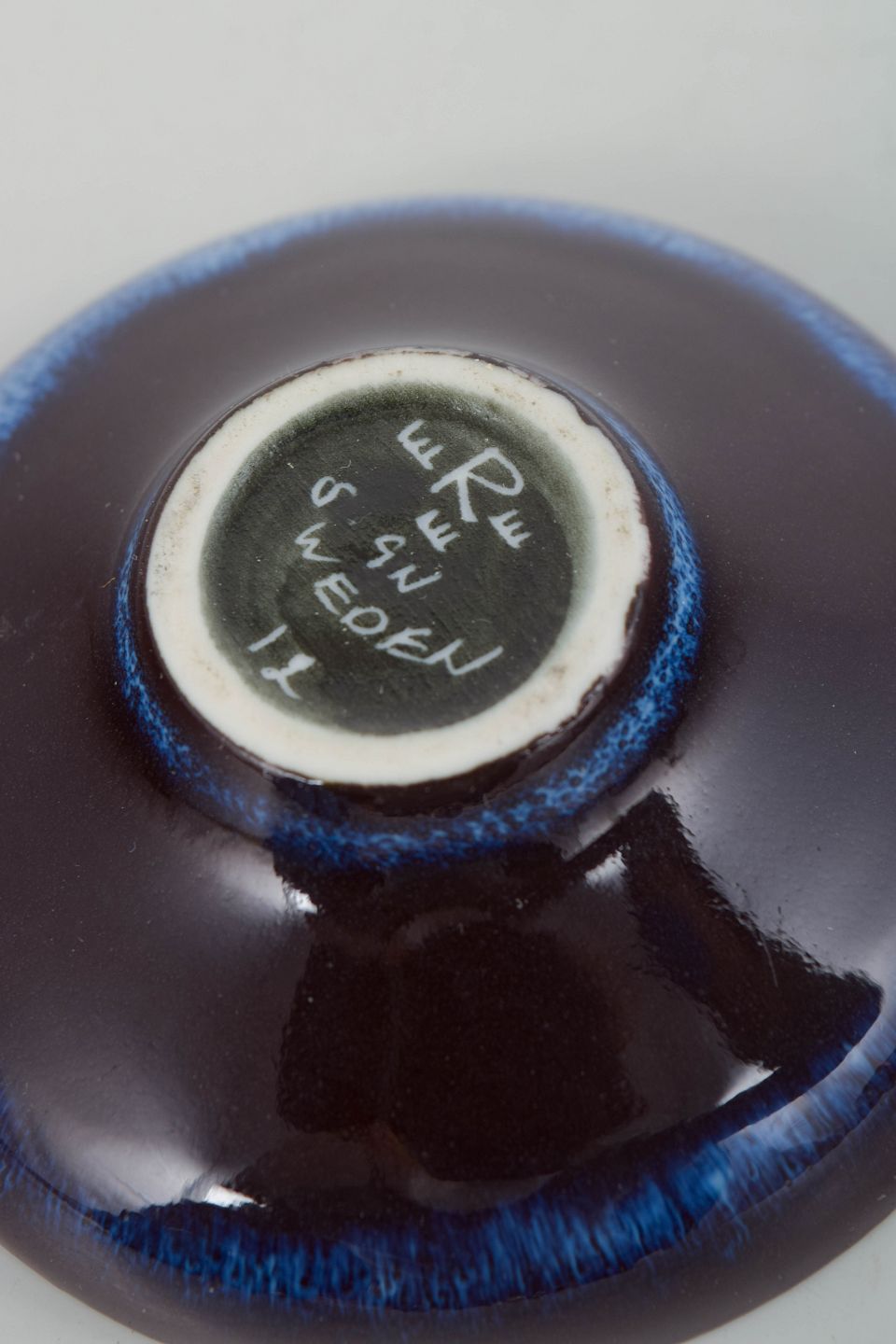 Gunnar Nylund (1904–1997) var en af de mest markante formgivere hos Rörstrand i midten af det 20. århundrede. Hans arbejde spænder fra seriefremstillede former til mere frie, kunstneriske objekter, hvor glasuren ofte spiller hovedrollen. Miniaturearbejder som denne skål viser hans sikre sans for proportion, farveforløb og materialets stoflighed.