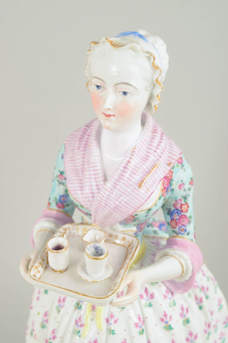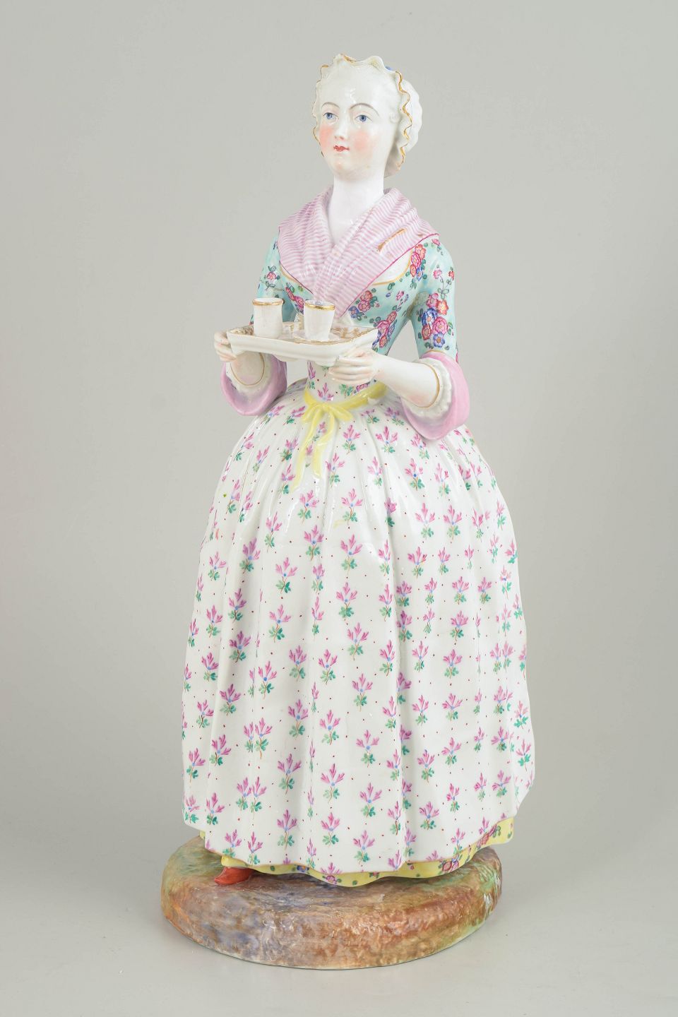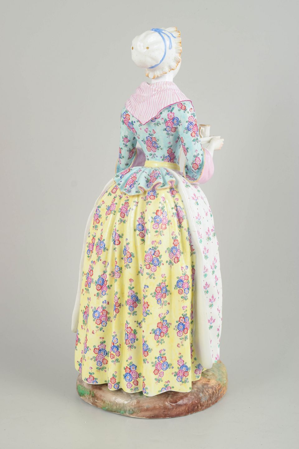 Stor Meissen porcelænsfigur fremstillet efter Jean-Étienne Liotards berømte motiv “La Belle Chocolatière” (1744). Figuren viser en kvinde i 1700-talsdragt med serveringsbakke og er rigt bemalet med blomsterdekoration, detaljeret ansigtsmaling og stafferede elementer. Udført efter model nr. 1470 og forsynet med Marcolini-mærke, dateret til ca. 1790’erne.