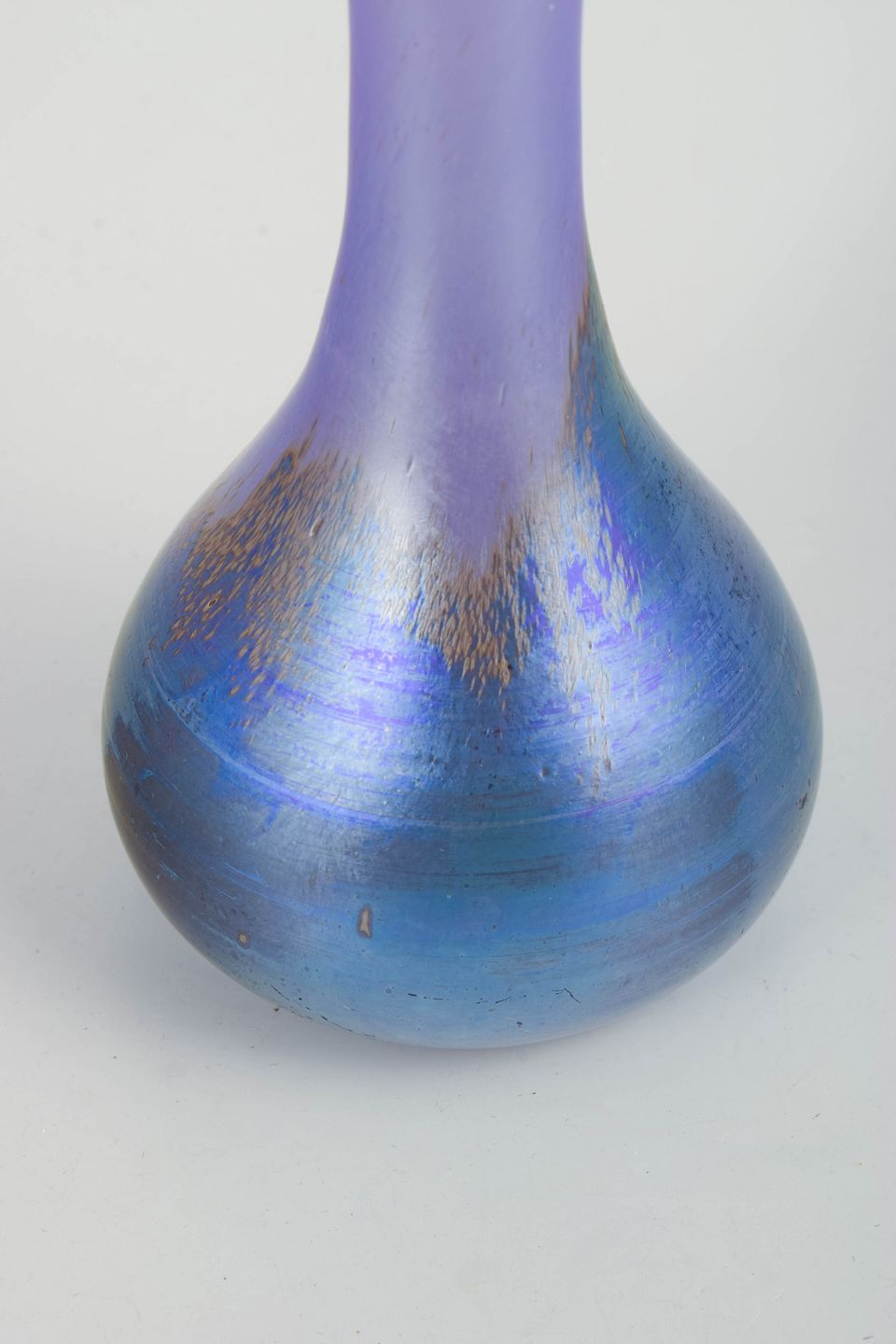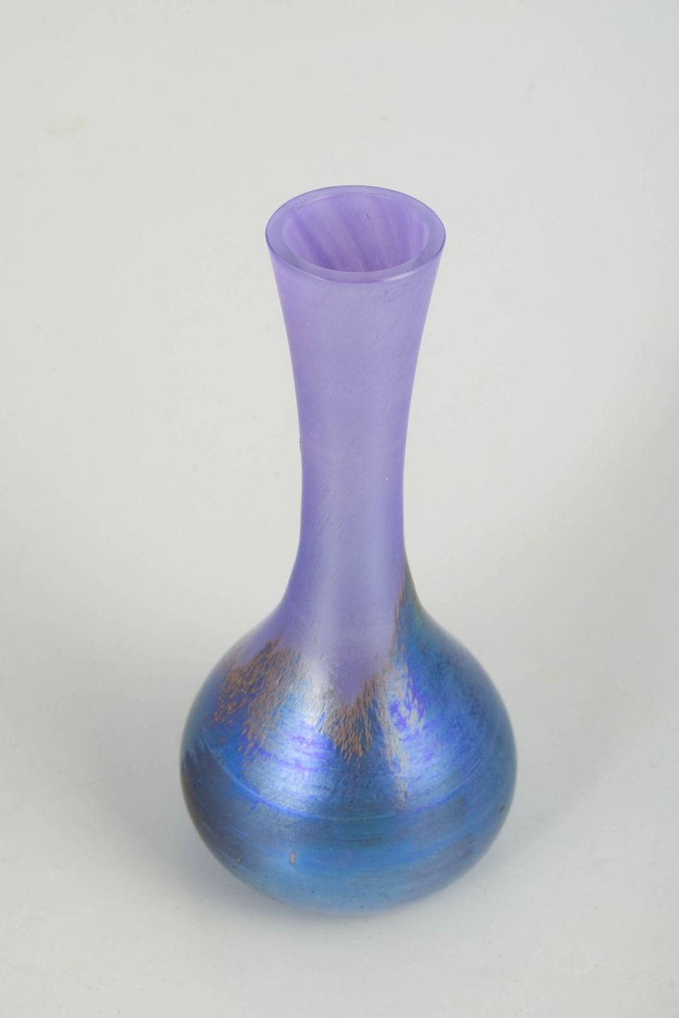 Slank Art Nouveau-vase i iriserende kunstglas med violet hals og blågrøn bug. Formen er elegant og strakt med smal åbning og afrundet krop, hvor den fine irisering giver et levende farvespil afhængigt af lyset. Overfladen fremstår let satineret med subtile glidende farveovergange, karakteristisk for Lötz’ produktion omkring år 1900.