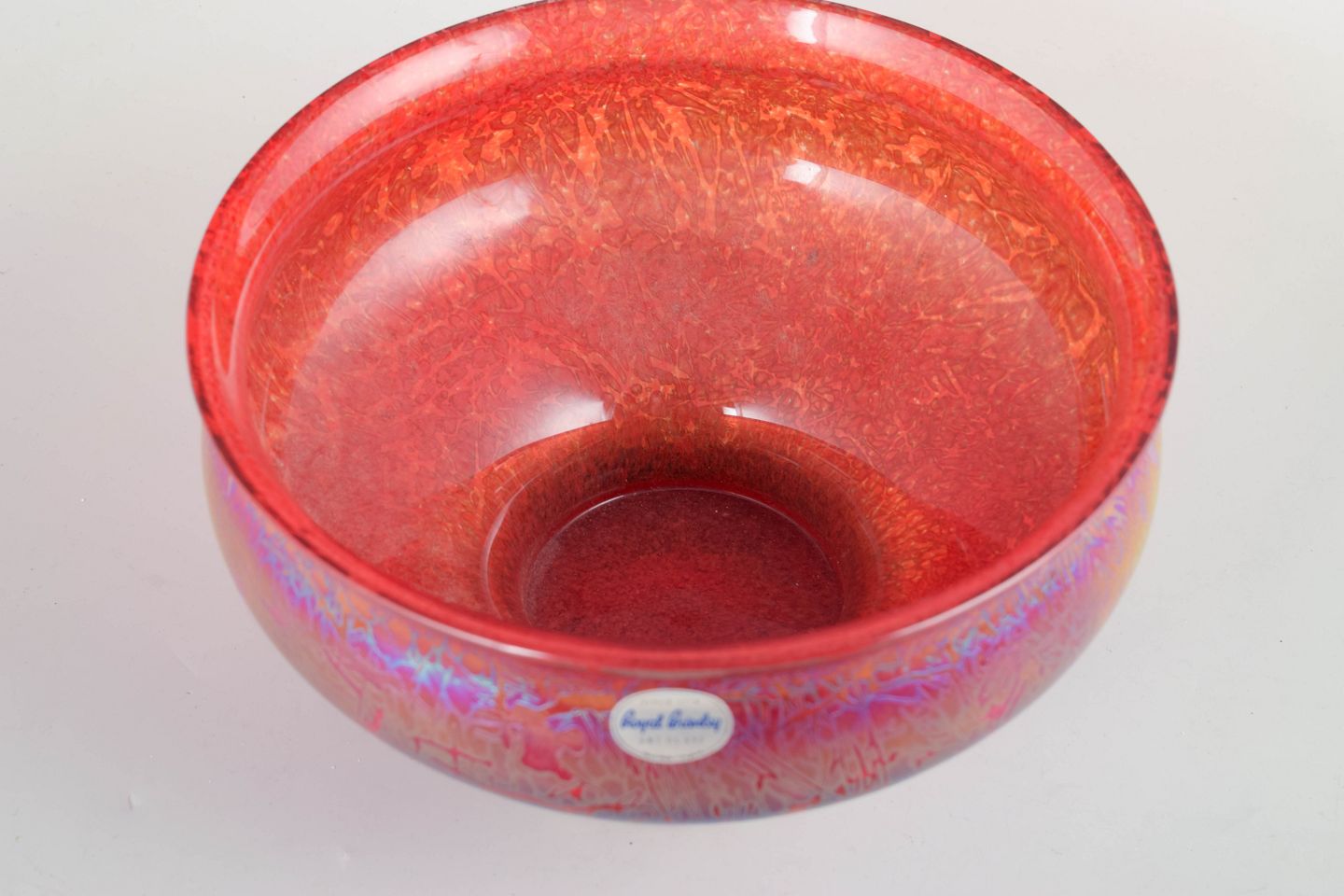 Dekorativ Royal Brierley kunstglasskål fremstillet i England, slutningen af det 20. århundrede. Skålen har en elegant, vid åbning og står på rund fod.
