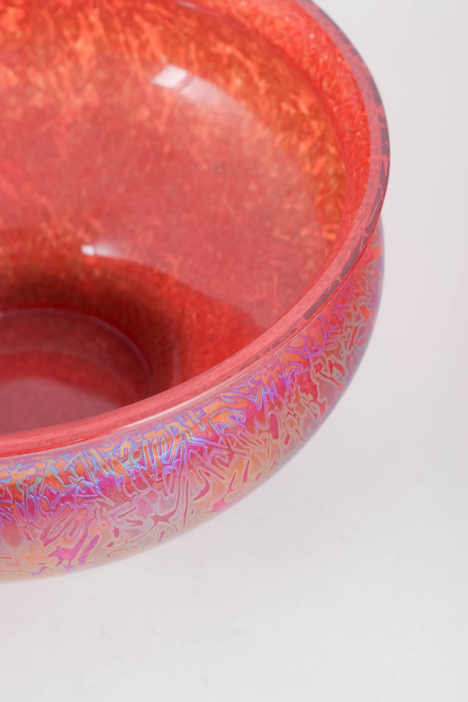 Overfladen fremstår med kraftig iriserende finish i nuancer af pink, guld, blå og violet. Under den metalliske glans ses en markant krakelé-effekt, som giver et levende og næsten olieskinnende udtryk. Et iøjnefaldende og dekorativt eksempel på Royal Brierleys senere kunstglasproduktion.