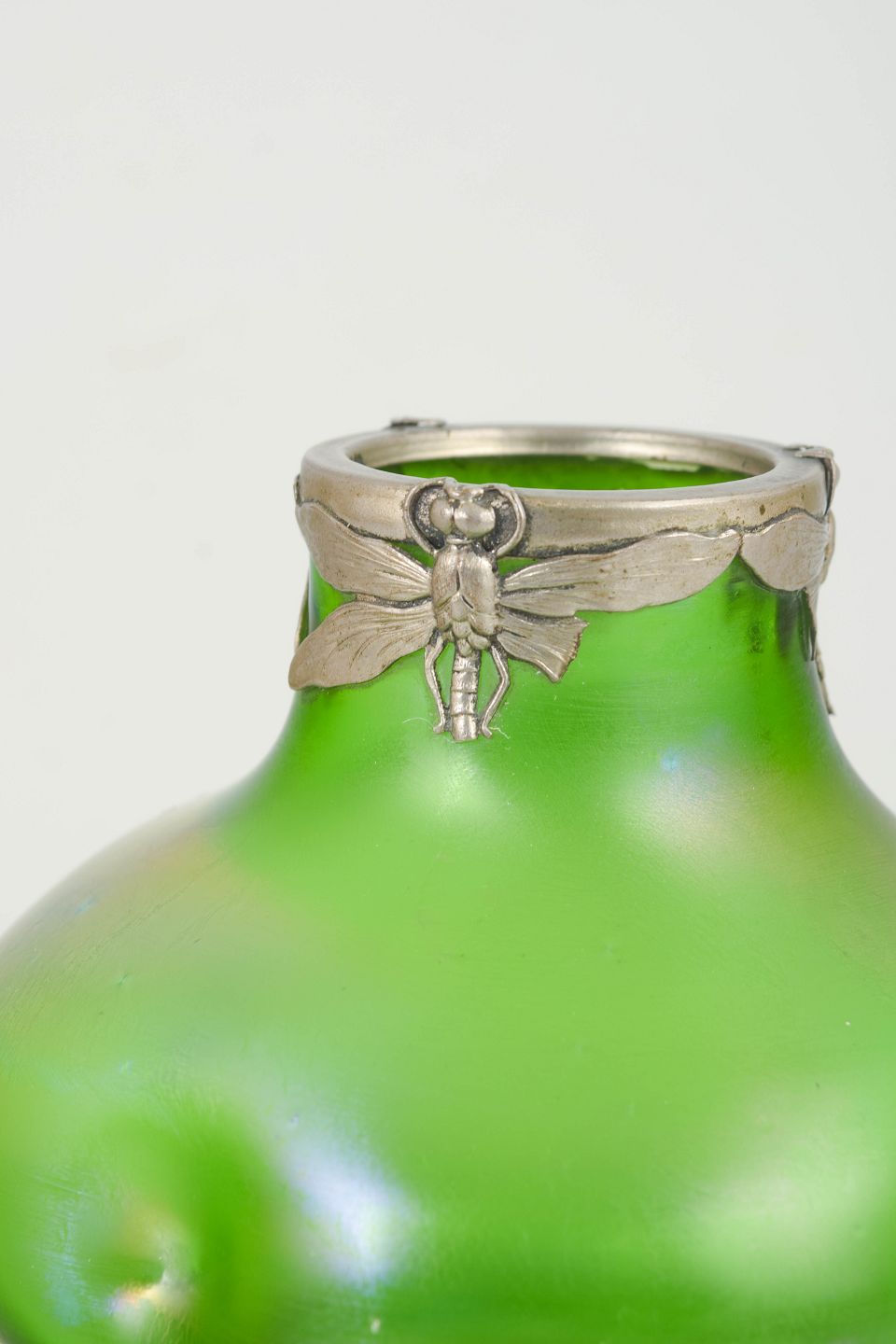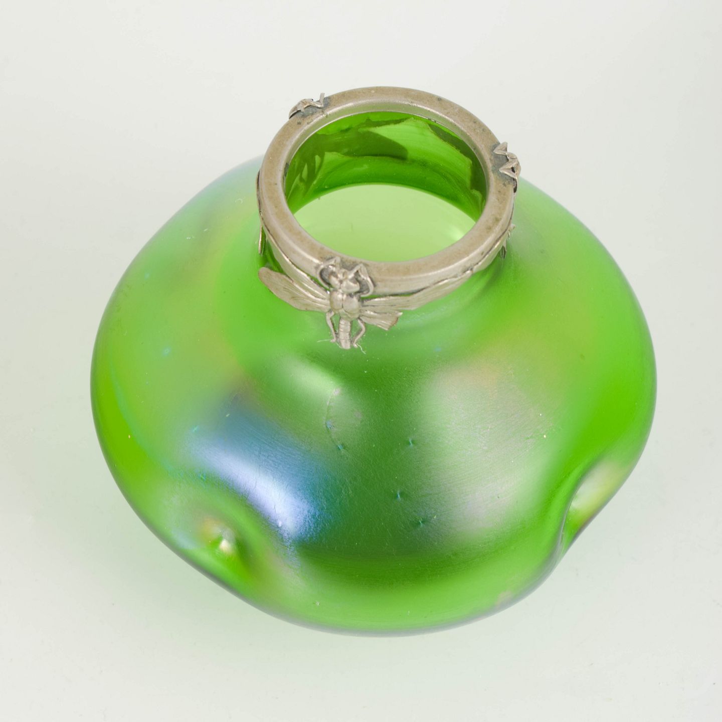 Art Nouveau-vase i iriserende kunstglas med klar grøn grundtone og blødt afrundede, organiske former. Lav og bred bug med let indtrukket hals, afsluttet med dekorativ tinmontering udført i et stiliseret, naturinspireret motiv. Overfladen viser et diskret farvespil med blålige nuancer mod foden, karakteristisk for perioden.