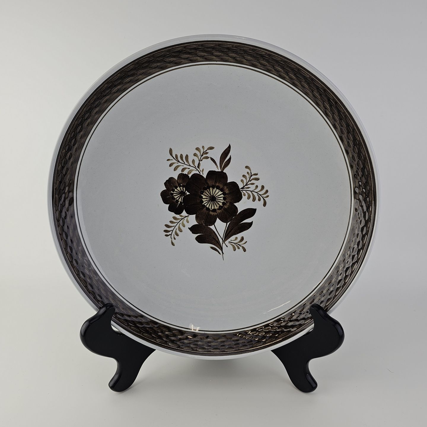 Fajancestellet med flettet kant og dekoration af brune blomster på lys baggrund med brun kant