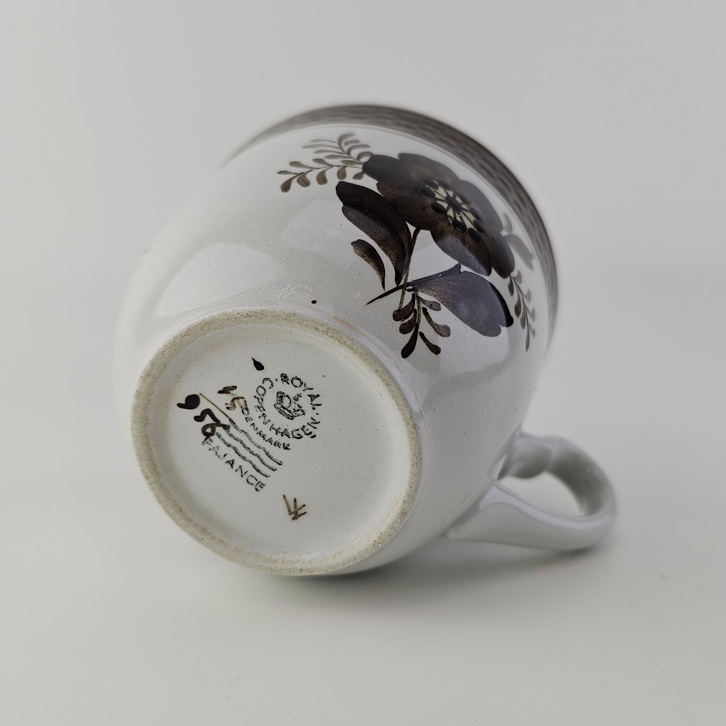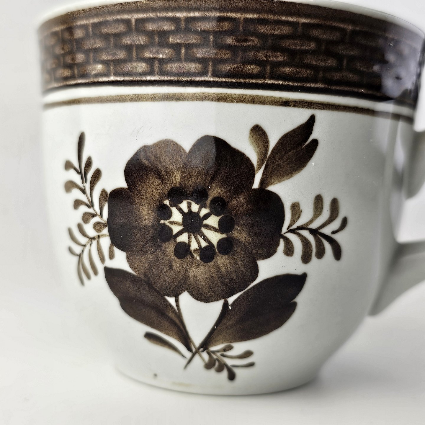 Fajancestellet med flettet kant og dekoration af brune blomster på lys baggrund med brun kant