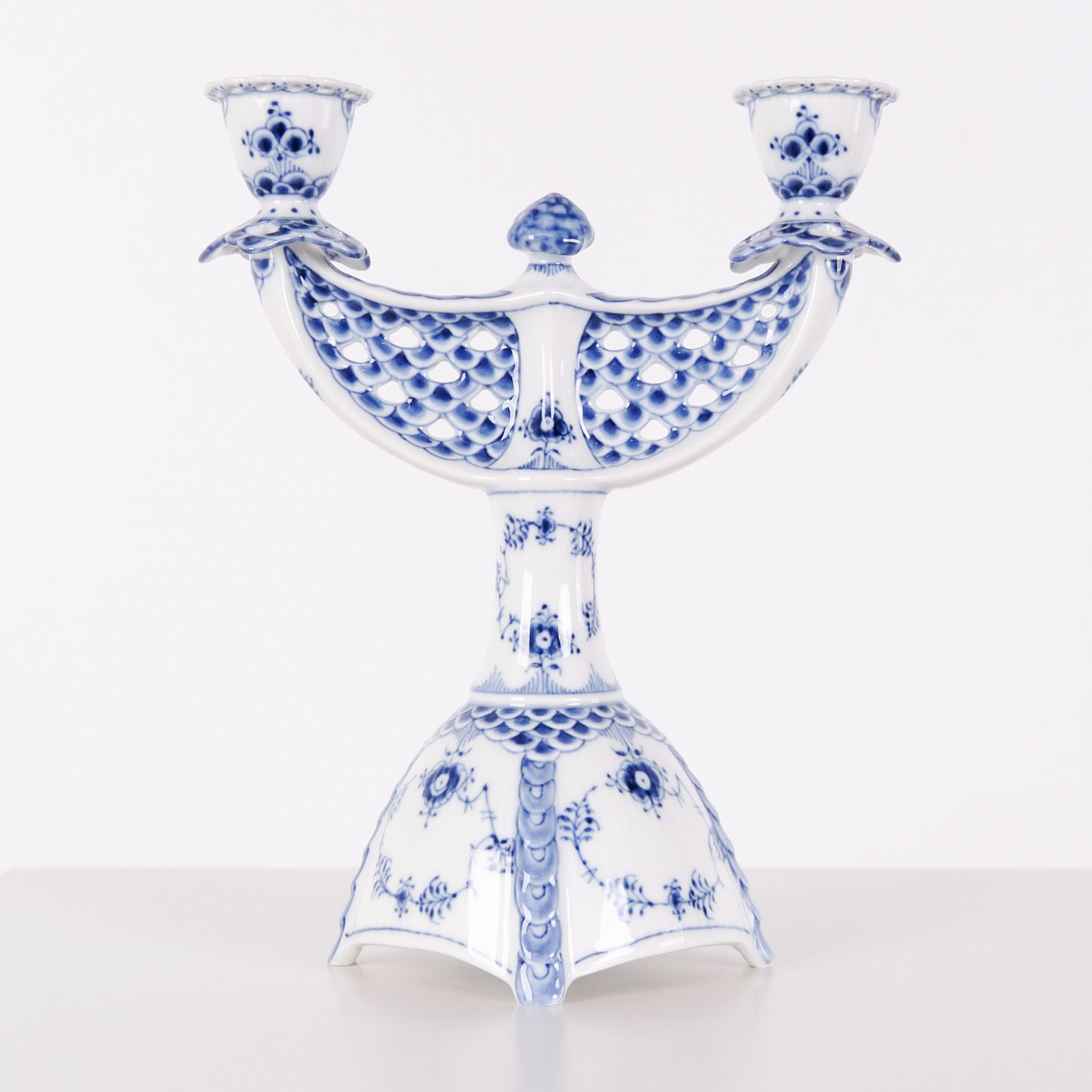 To-armet lysestage i musselmalet helblonde porcelæn, model 1169, produceret af Royal Copenhagen. Lysestagen er udført i håndmalet porcelæn med det klassiske helblonde-mønster, kendetegnet ved gennemgående gennembrudt bort og detaljeret underglasurdekoration. Modellen er produceret som 1. sortering og indgår i Royal Copenhagens traditionelle servicenproduktion.