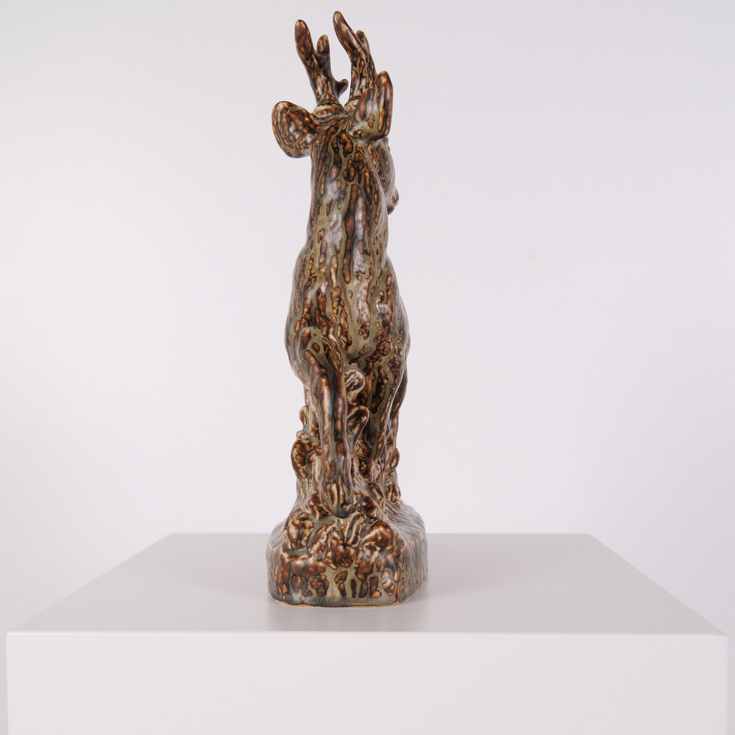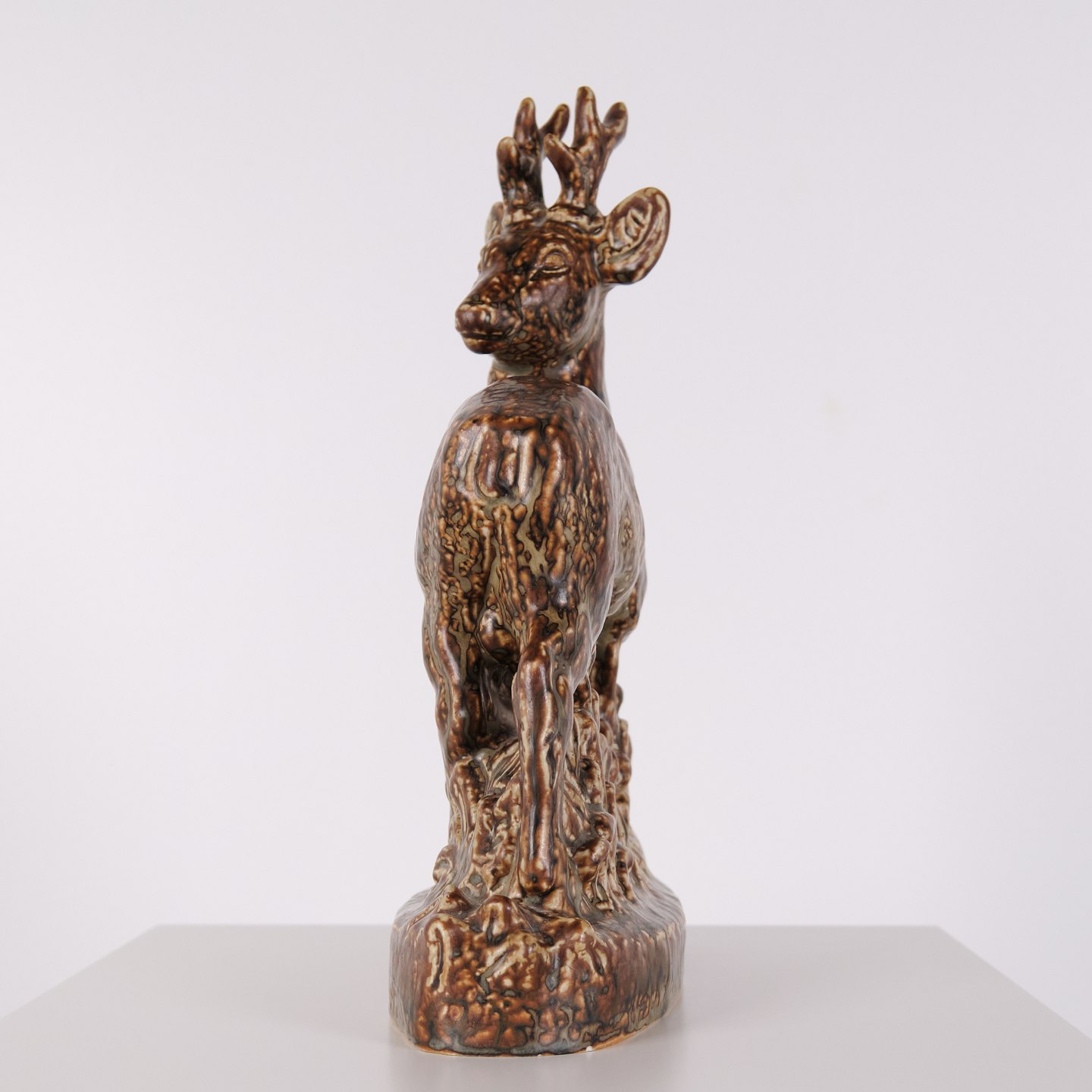 Stentøjsfigur med motiv af stående hjort, model nr. 21333, designet af Knud Kyhn for Royal Copenhagen. Figuren er udført i stentøj og indgår i Knud Kyhns serie af dyrefigurer produceret hos Royal Copenhagen i midten af det 20. århundrede. Modellen er kendetegnet ved en markant kropsform og tydelig bearbejdning af overfladen, som er gennemgående for Kyhns arbejde med naturmotiver.