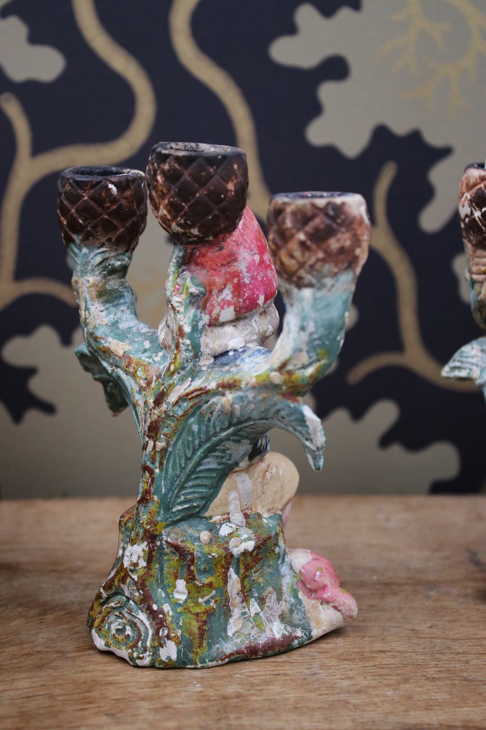 Gammel julestage i form af julenisse i bemalet gips siddende på træstub og bære 3 små julelys...