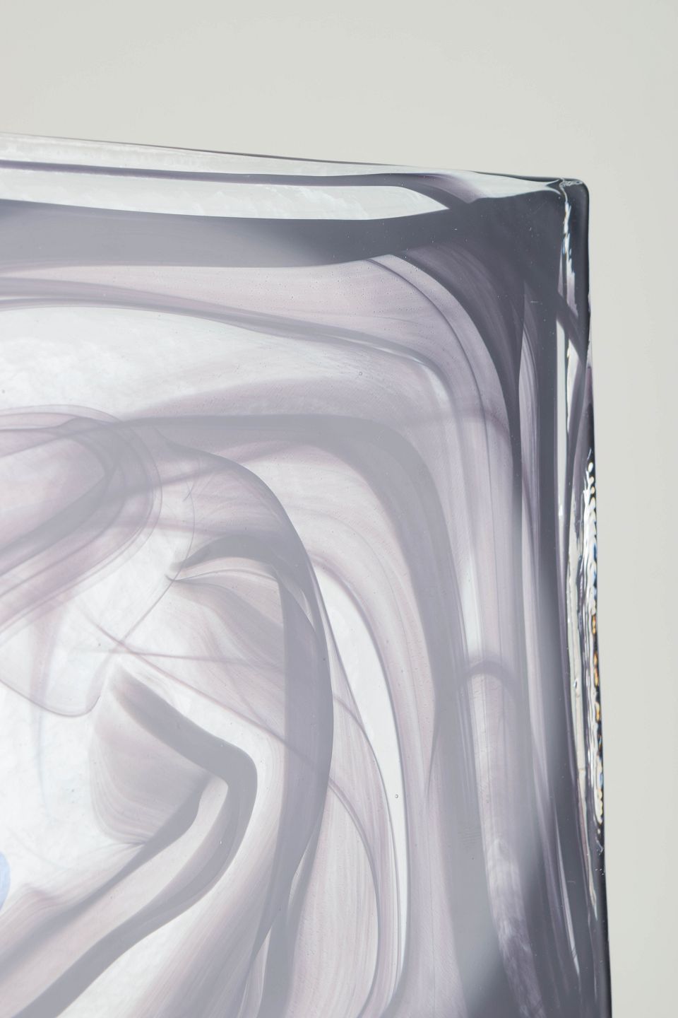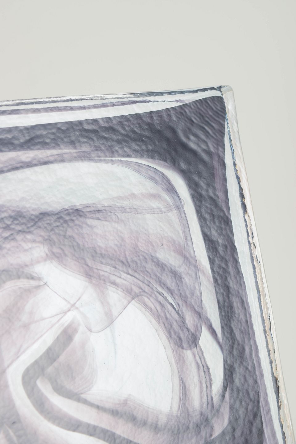 Fladt, kvadratisk objekt i klart glas med indkapslede, slyngede sorte og grå glastråde, der danner et abstrakt cirrus-lignende mønster. Modellen er kendt som Cirrus Black.
