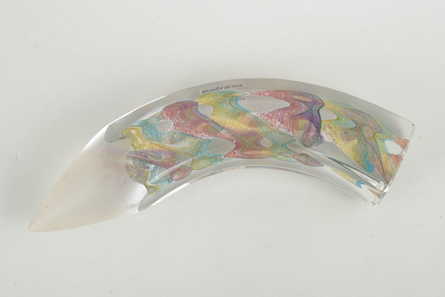 Buet skulptur i klart kunstglas med indlagte, flerfarvede, iriserende mønstre i organiske former; atelierarbejde, nummereret 80/250.