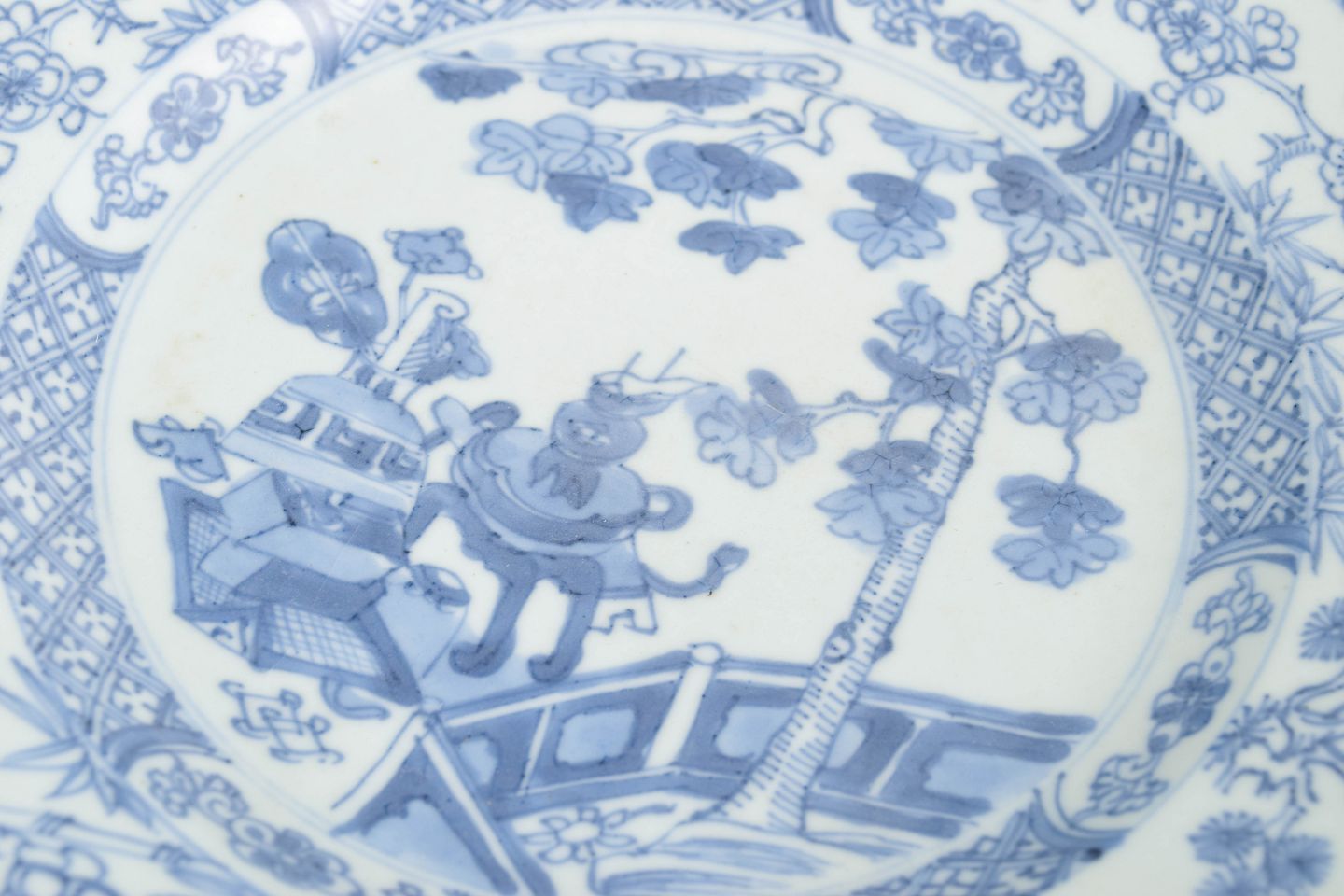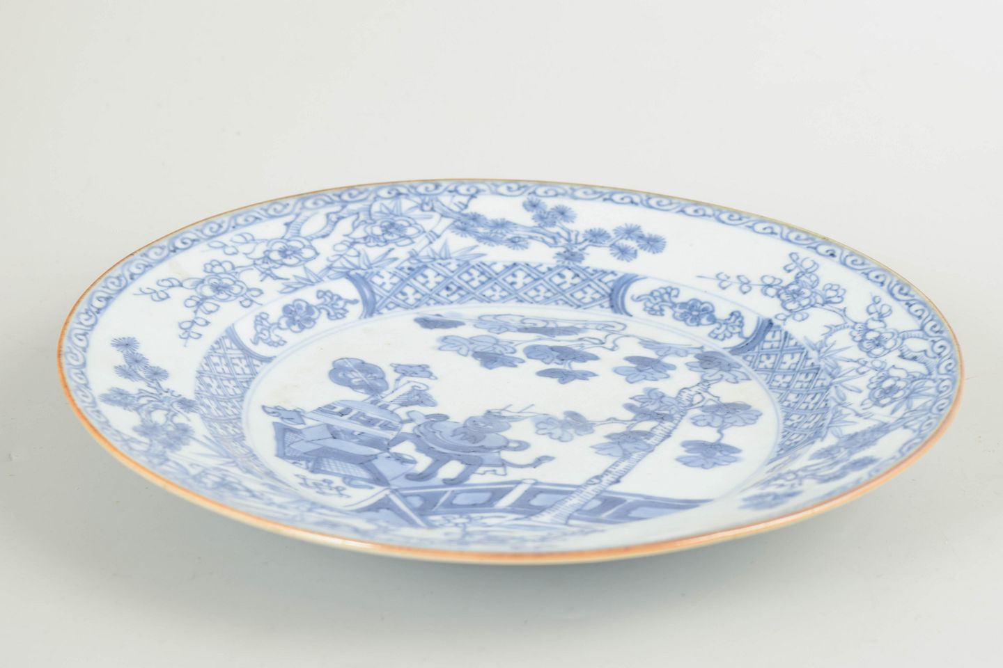 Rund tallerken i porcelæn dekoreret i underglasurblåt med orientalsk landskabsmotiv med figur, bro og blomstrende træer samt blomster- og ornamentbort langs randen.