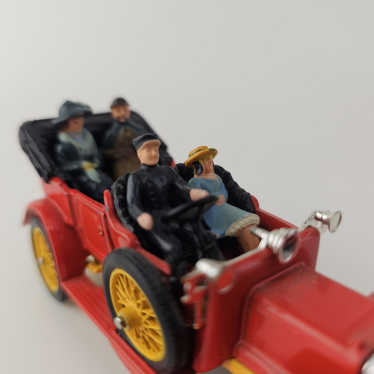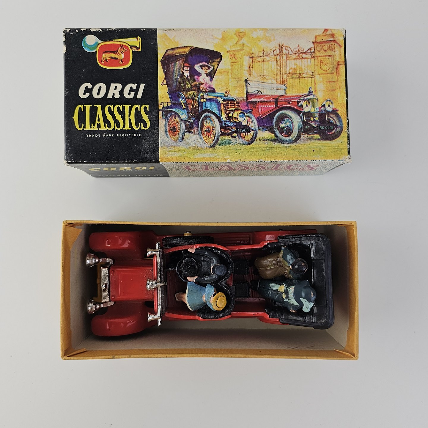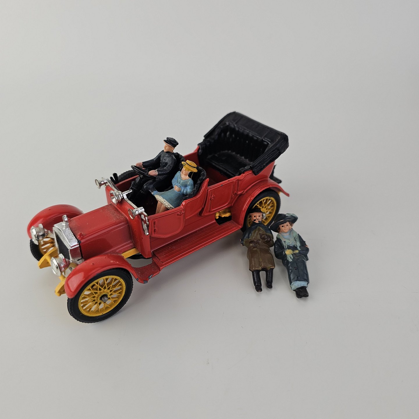 Corgi classics modelbil 1920 Daimler. Rød bil med gule hjul inklusiv fire passagerer, kommer i original kasse