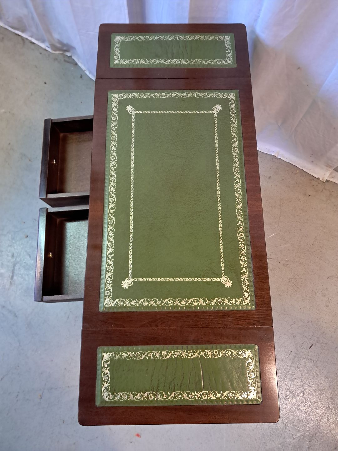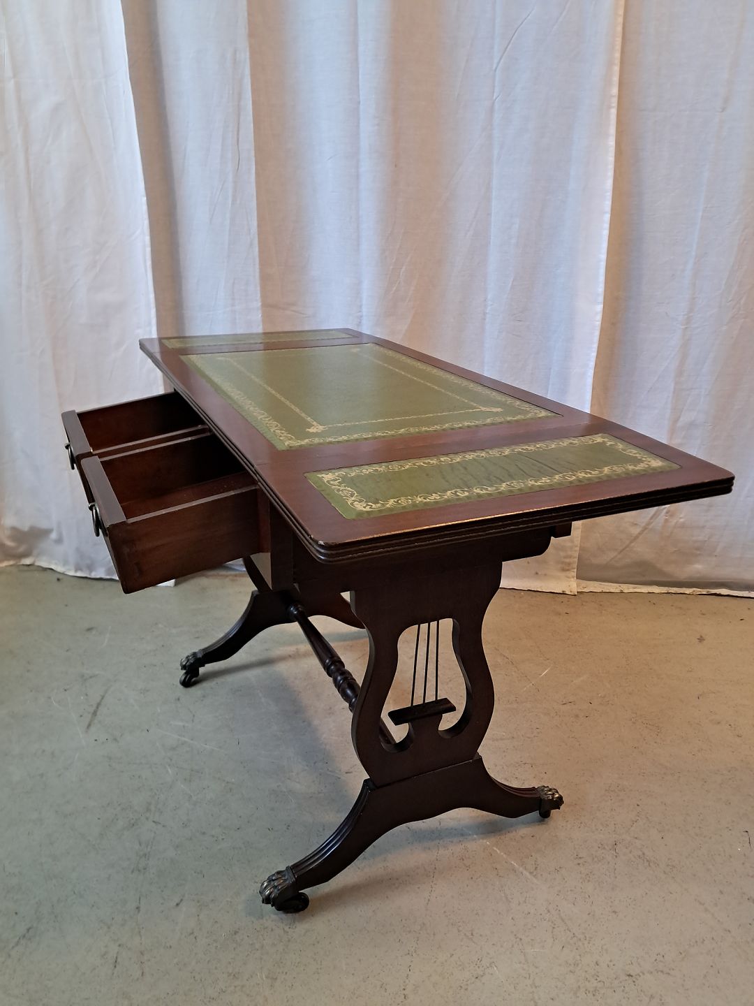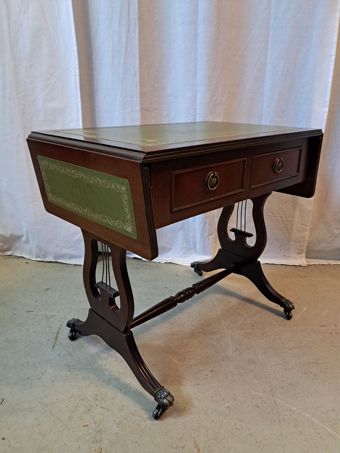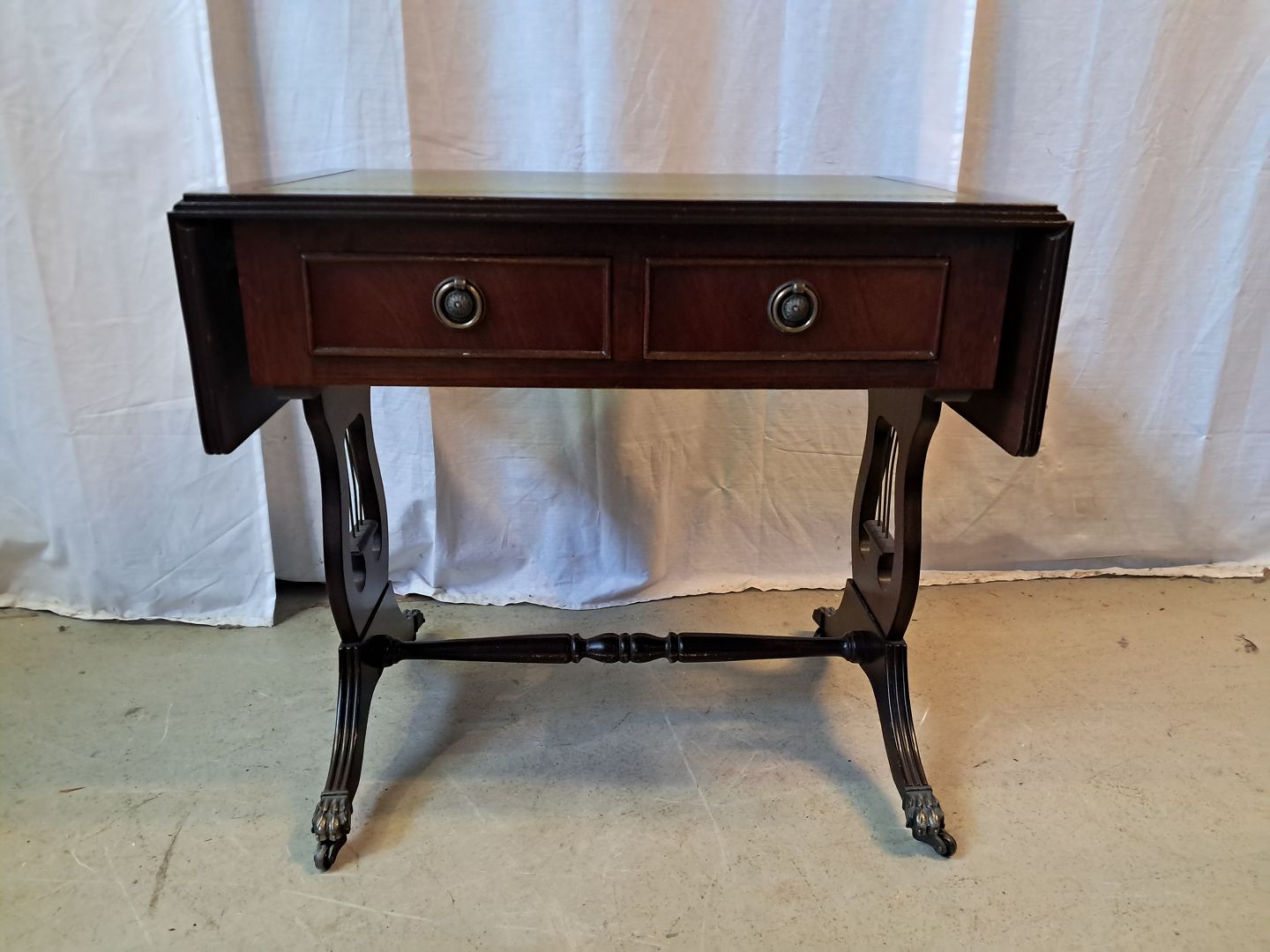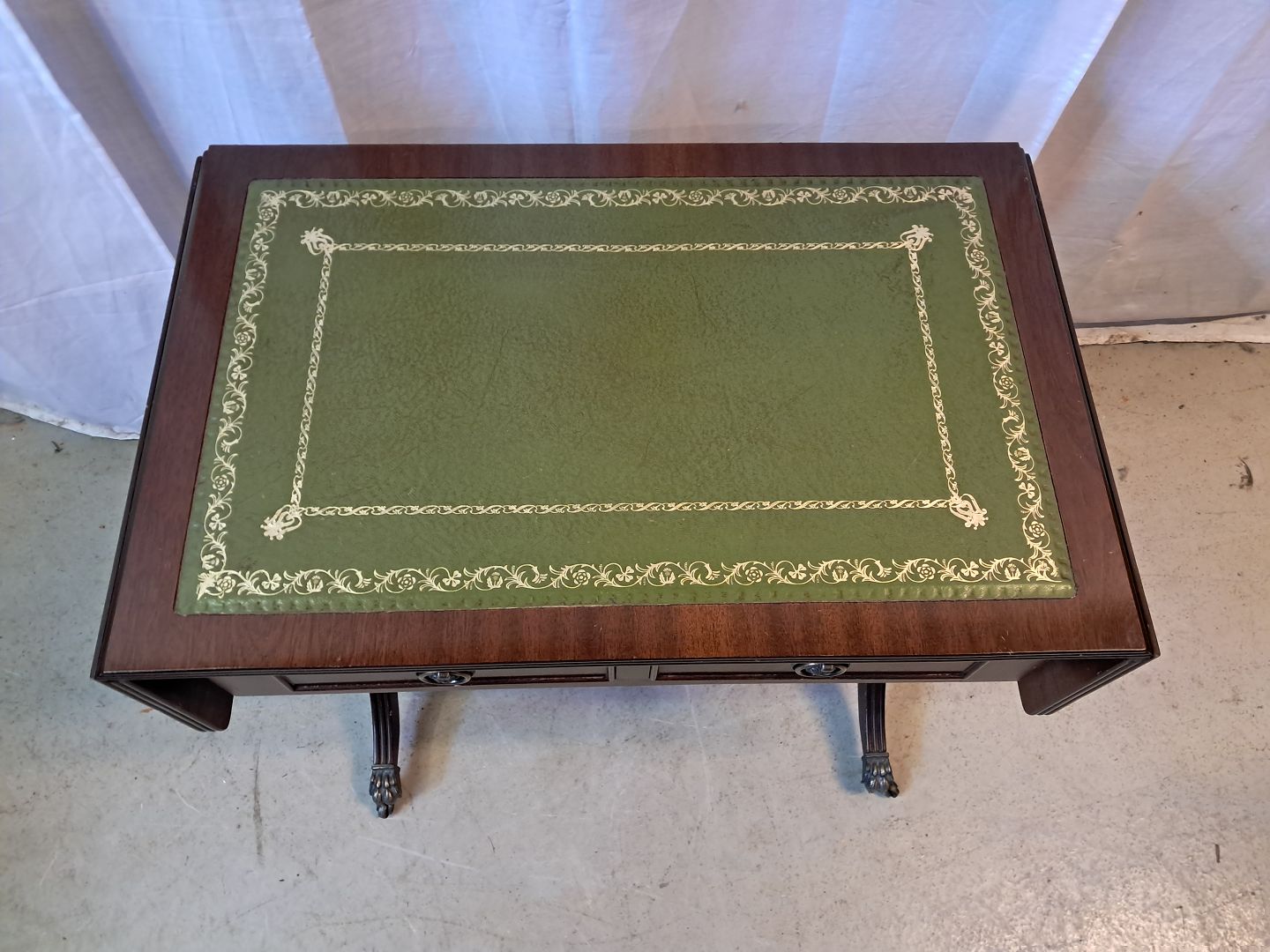 Sofabord i fineret mahogni med læderindlæg, fra 1980erne.