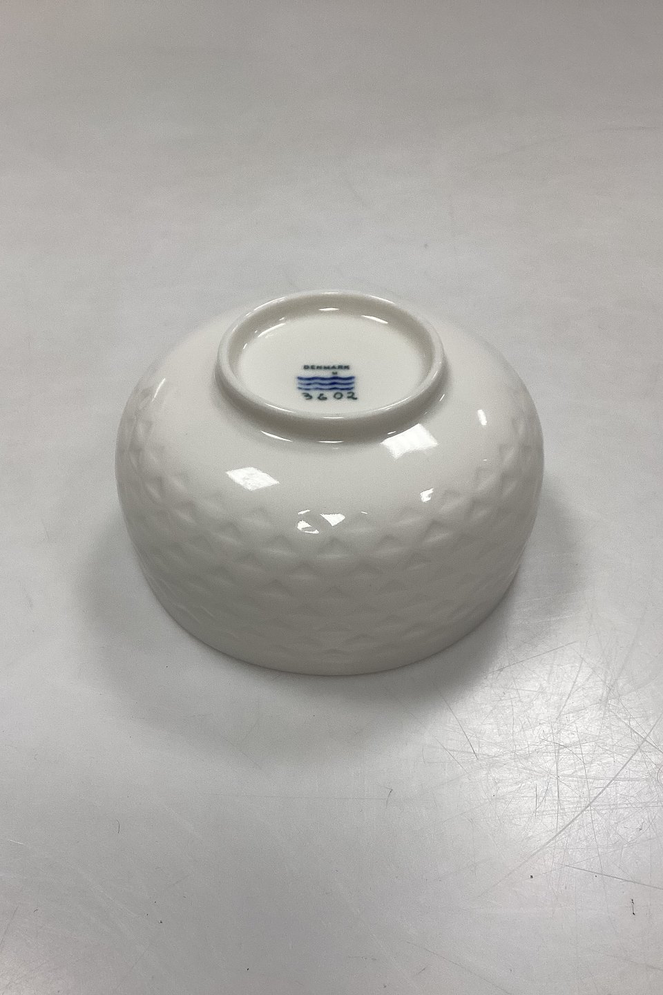 Royal Copenhagen Blanc de Chine Skål No. 3602. Reliefmønster med trekanter. Måler 10,3 cm x 6 cm / 4,05 in. x 2,36 in.