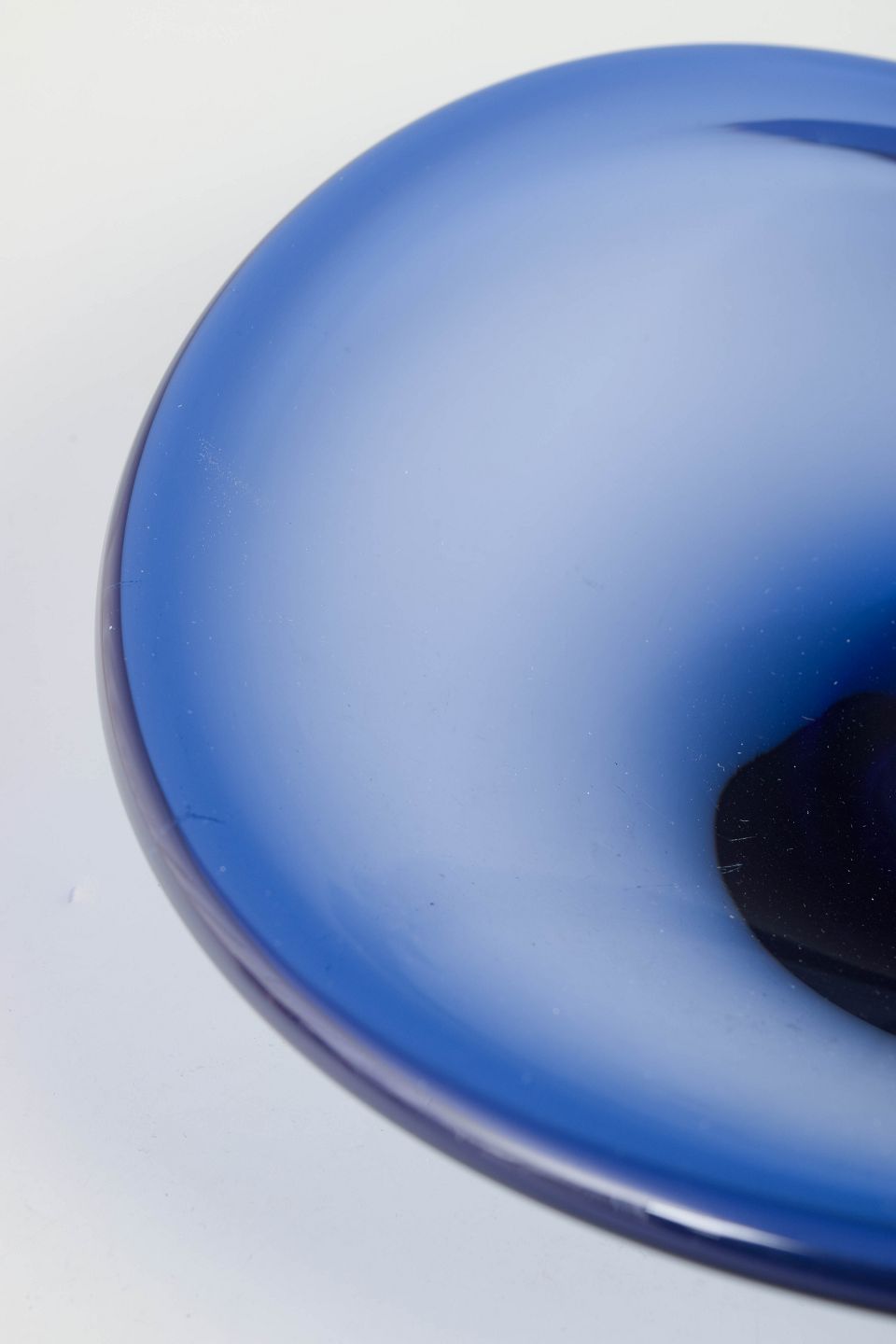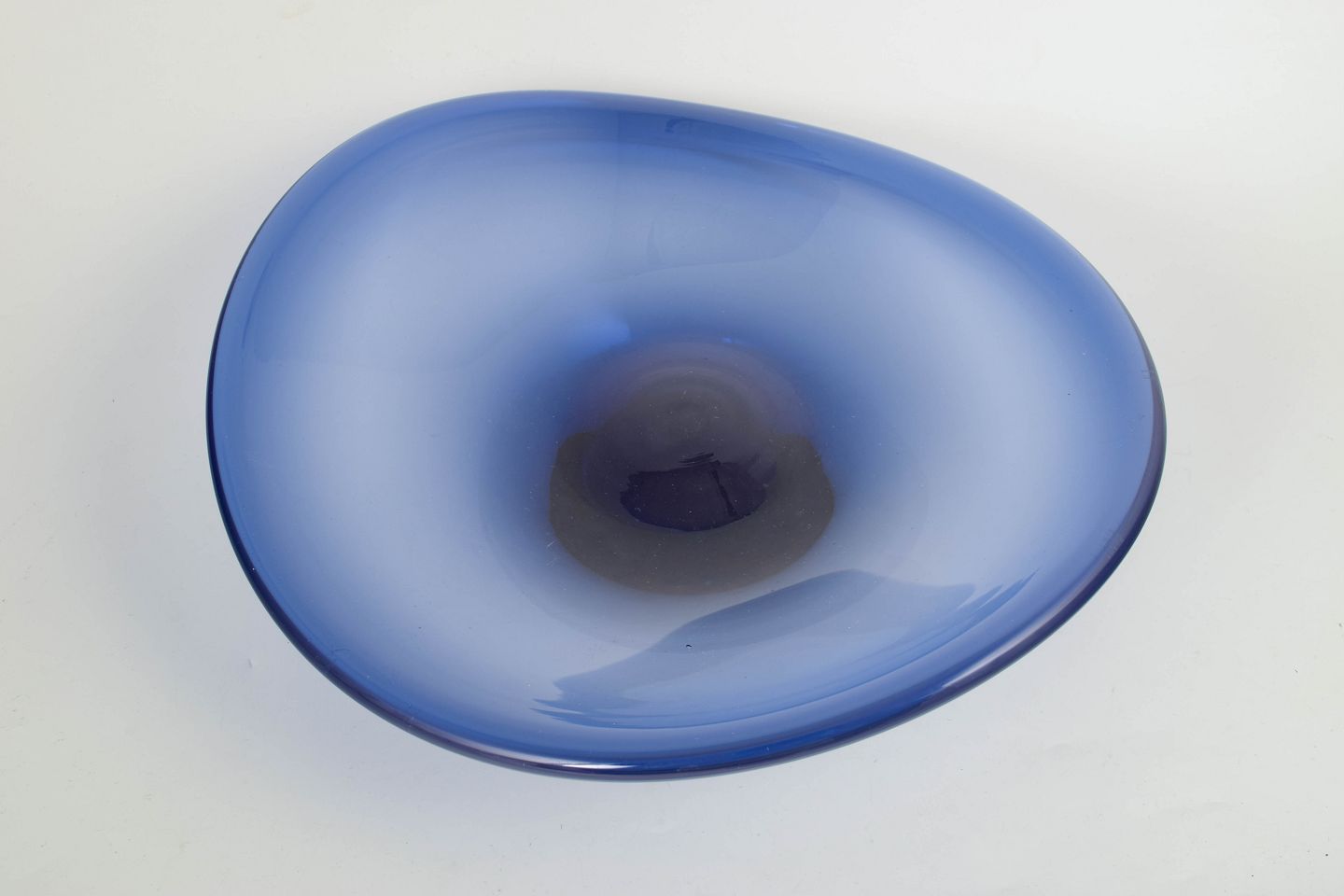 Organisk formet skål i mundblæst glas med bløde, flydende linjer og let opadbøjet kant. Formen er karakteristisk for Per Lütkens skulpturelle tilgang til glas i 1960’erne. Signeret i bunden.