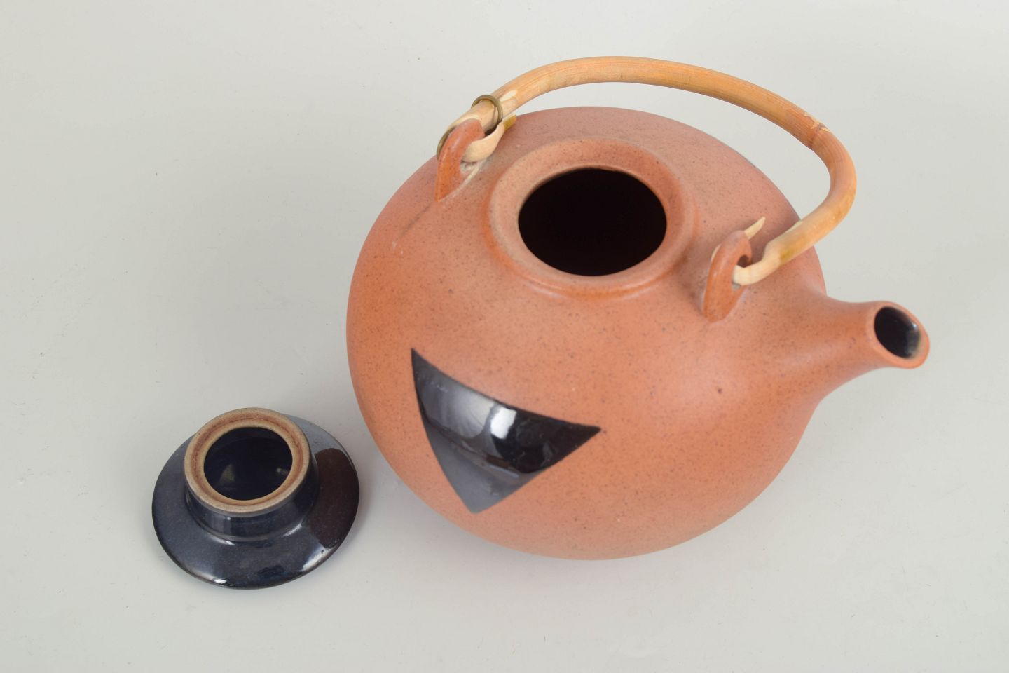 Sjælden tepotte i stentøj med mat, varm orange/sandfarvet glasur og markant sort, trekantet dekoration på korpus. Udstyret med sort låg samt høj bøjlehank, som giver en skulpturel silhuet. Model 332.