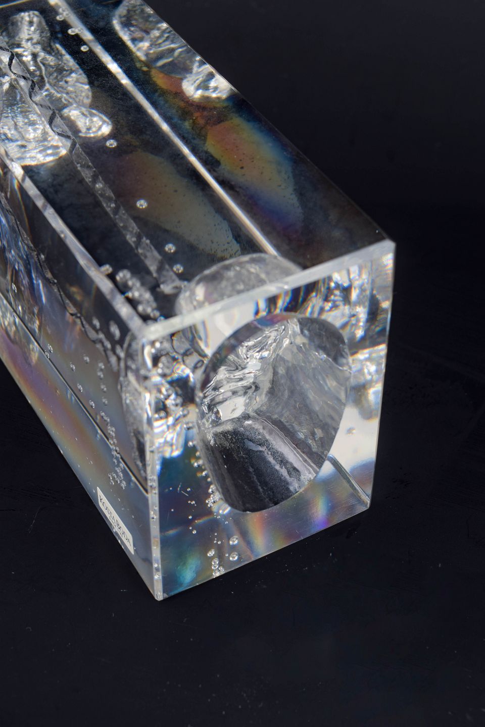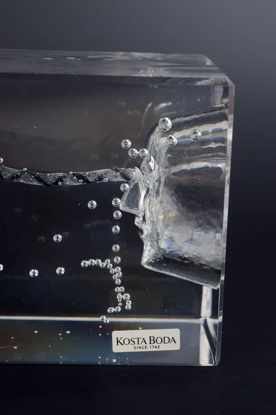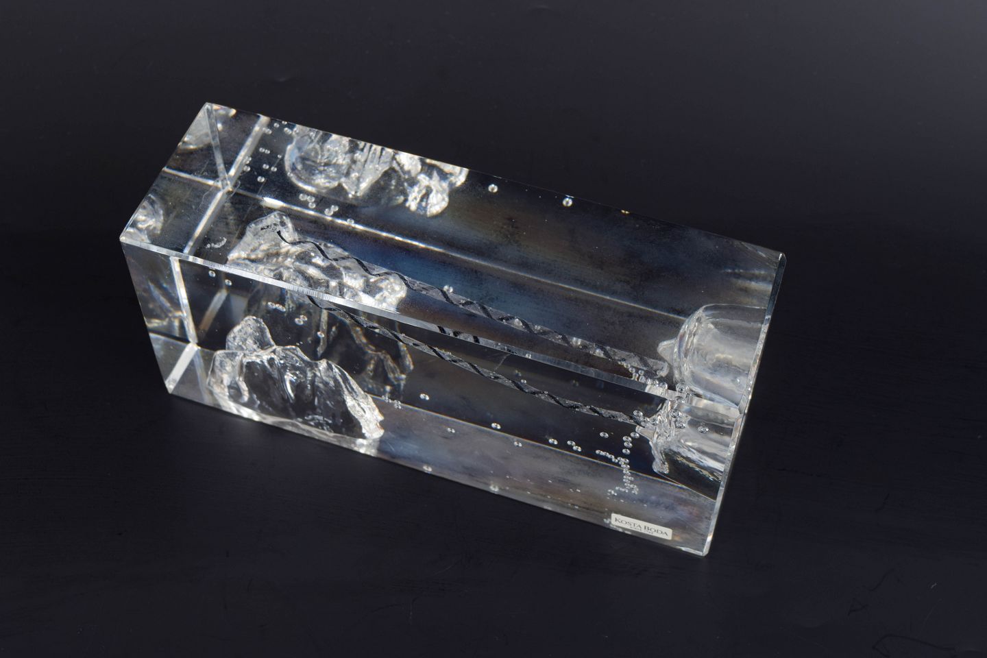 Rektangulær, massiv kunstglasskulptur med indkapslet figurativt motiv og indsmeltede luftbobler, udført i klart glas med indre strukturer og optiske brydninger. Original Kosta Boda-klistermærke.