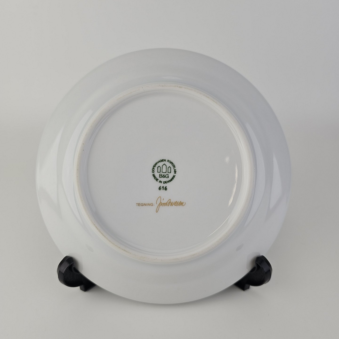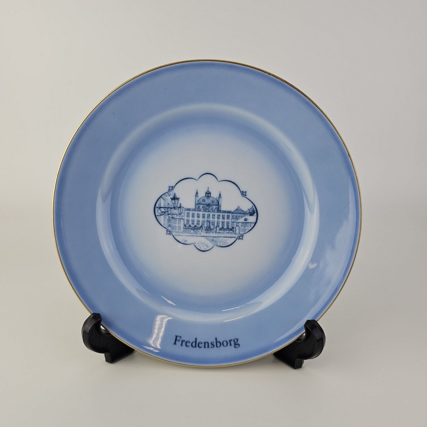 Kagetallerkener i blåmalet porcelæn dekoreret med motiver af danske slotte og guldkant