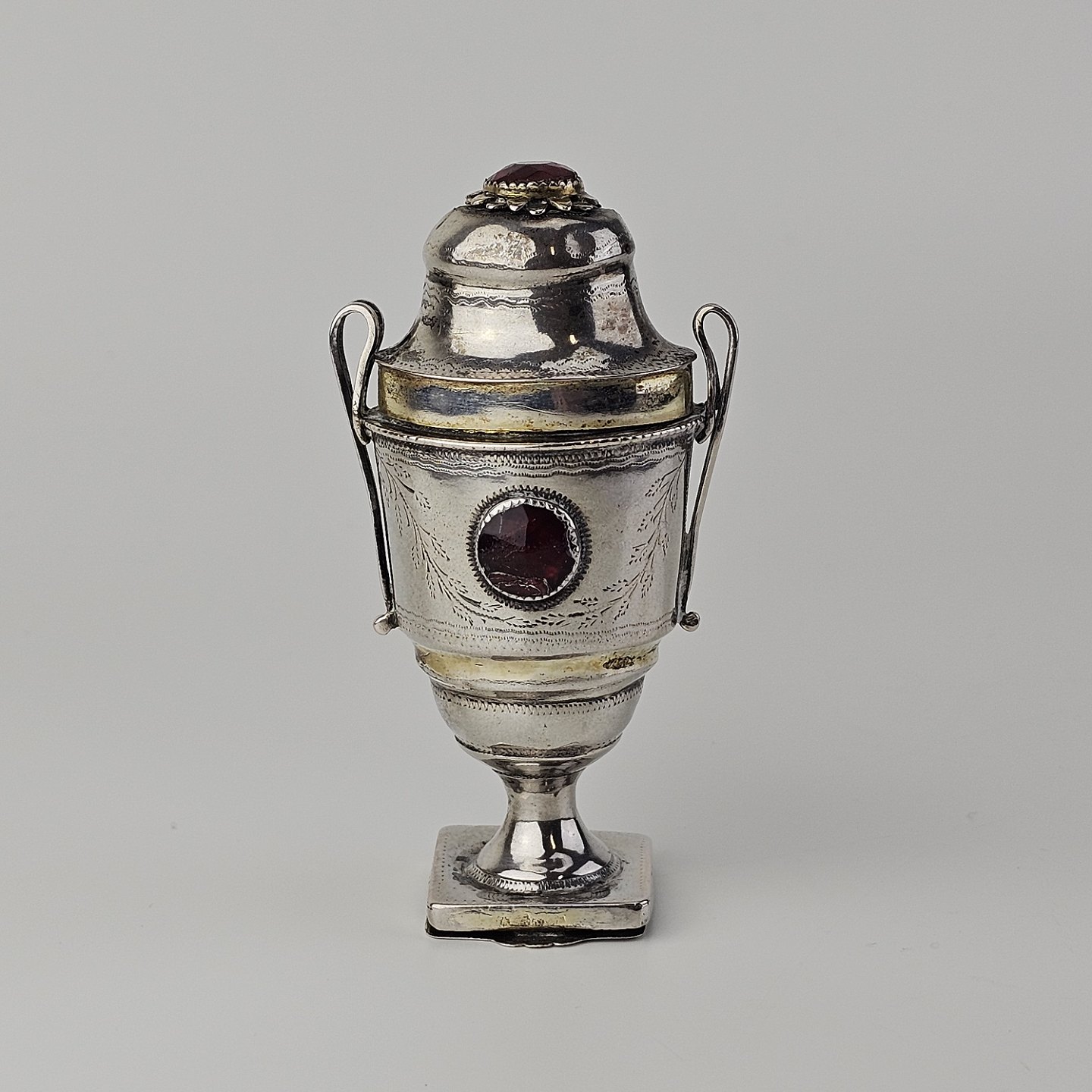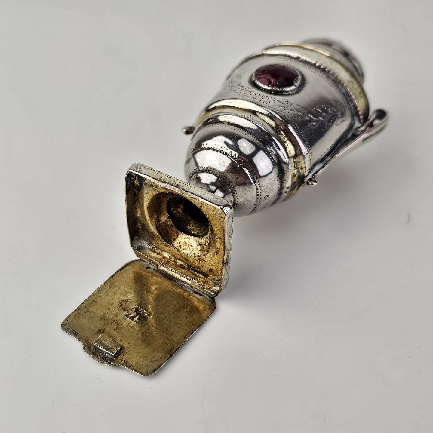 Hovedvandsæg i sølv dekoreret med forskellige smykkesten og bladværk