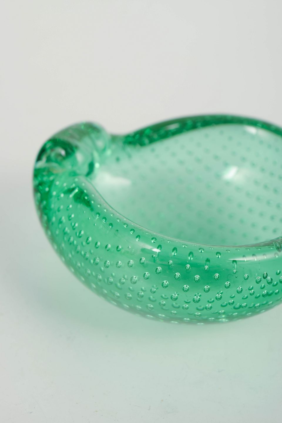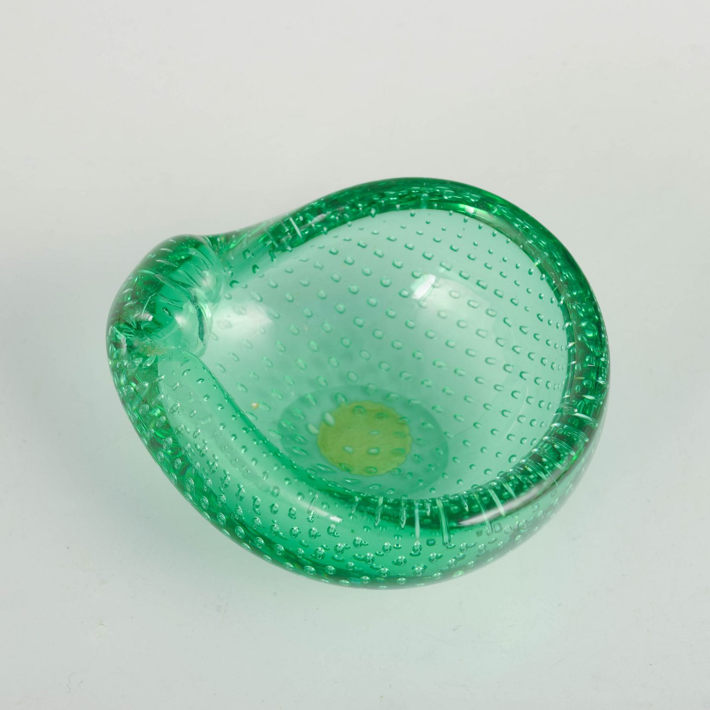Murano-glaskunsten fra midten af det 20. århundrede er kendt for håndværksmæssig kunnen og eksperimenter med farver, bobler og strukturer i glasset. Små skåle som denne blev ofte udført som dekorative objekter og souvenirproduktion, hvor klistermærker med oprindelsesangivelse fungerede som kvalitets- og proveniensmarkering.