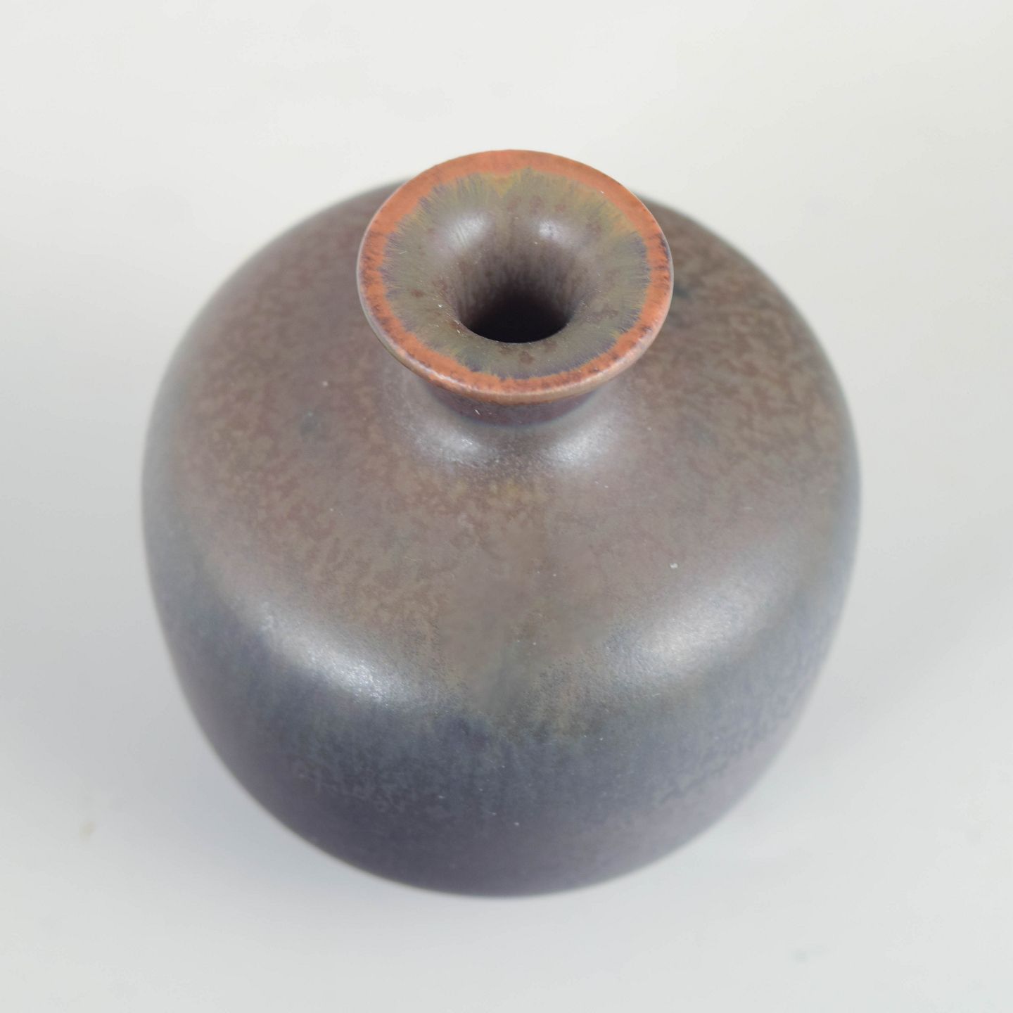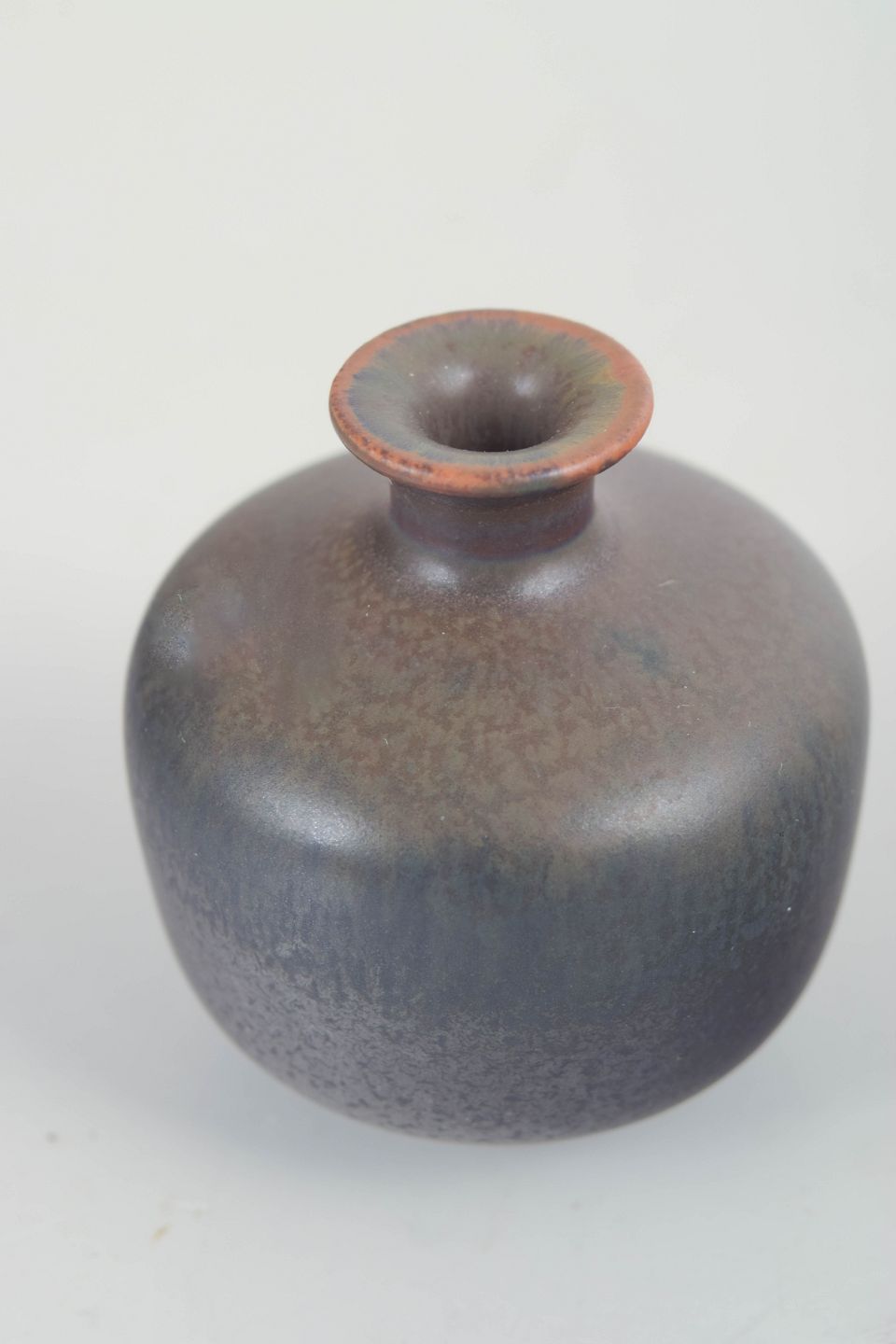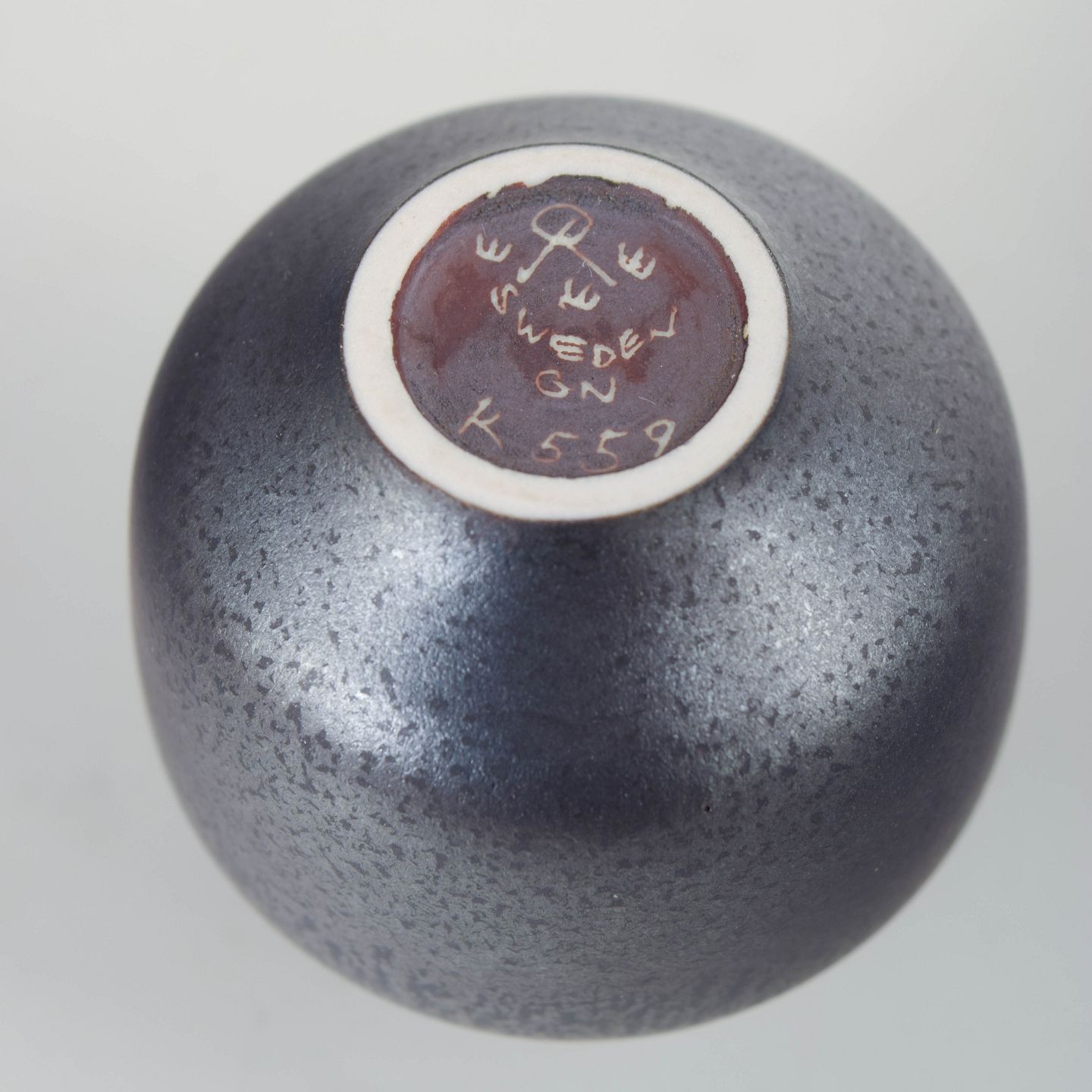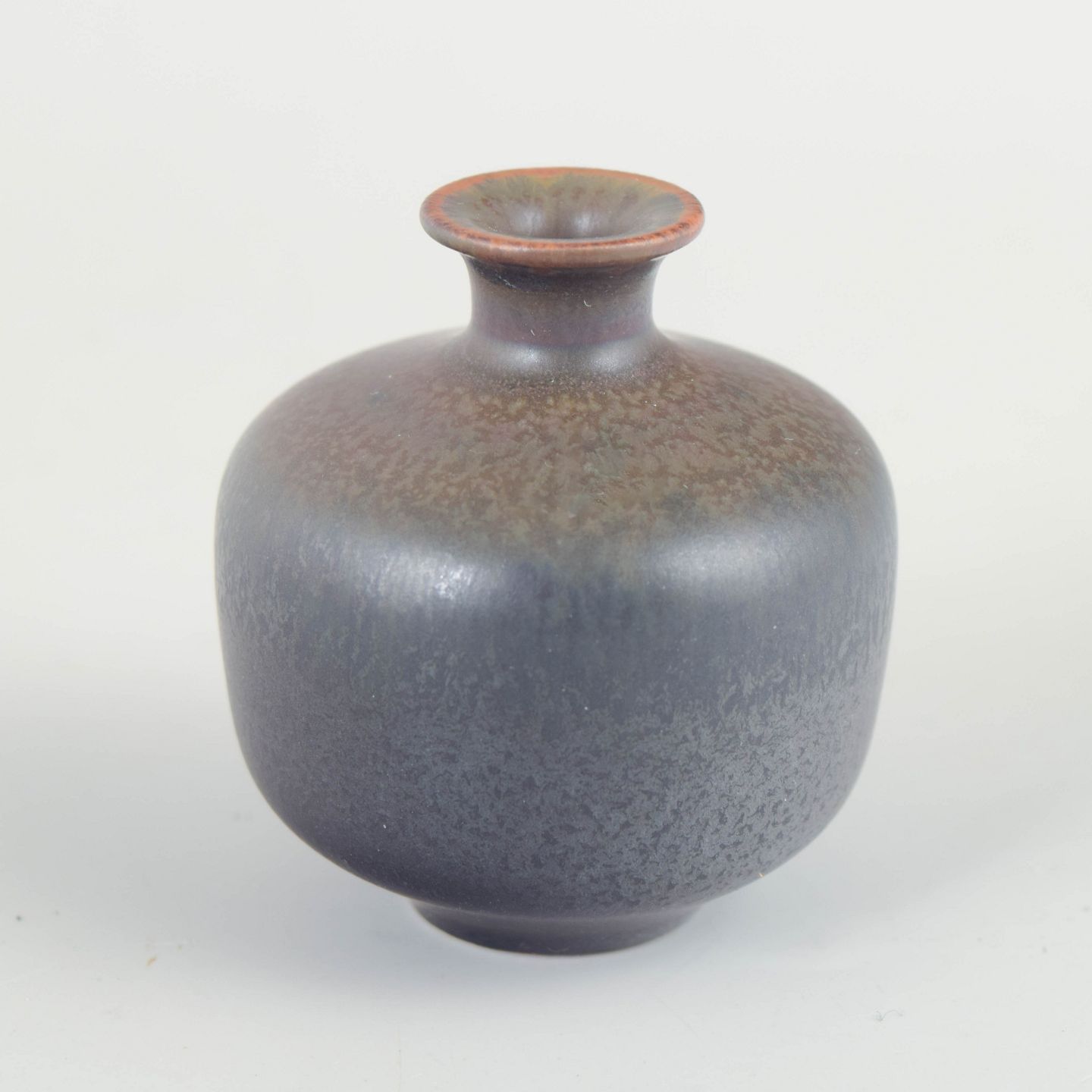 Kompakt miniaturevase i drejet stentøj med afrundet korpus og smal hals, udført med finspættet mat glasur i mørke gråbrune nuancer. Model 559, 1. sortering.