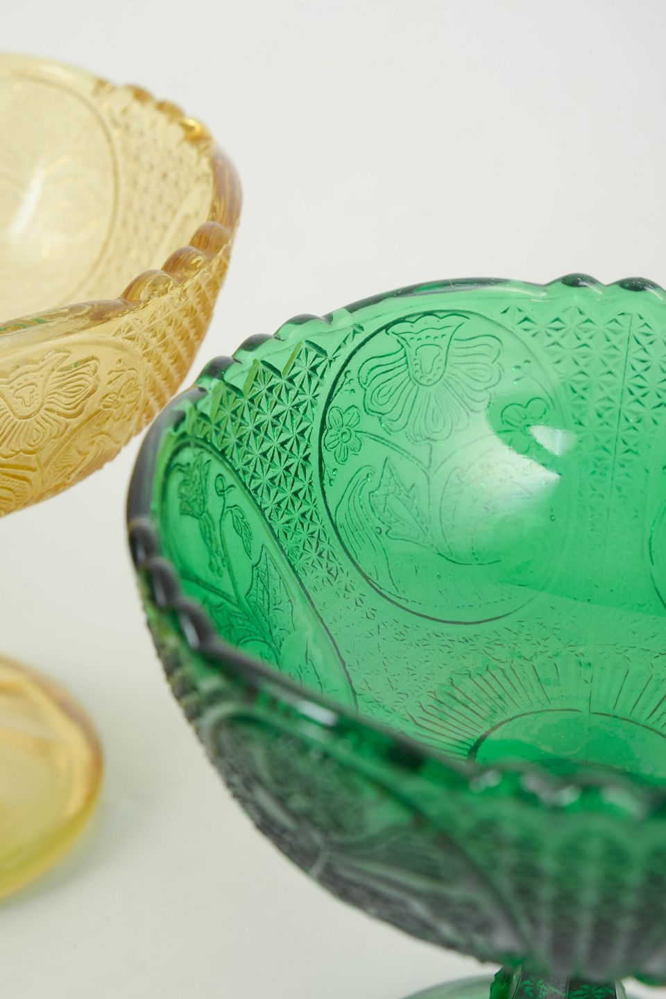 Sæt med to dessertskåle i presset glas i ravgul og grøn tone med reliefdekoreret kumme og balusterformet fod.