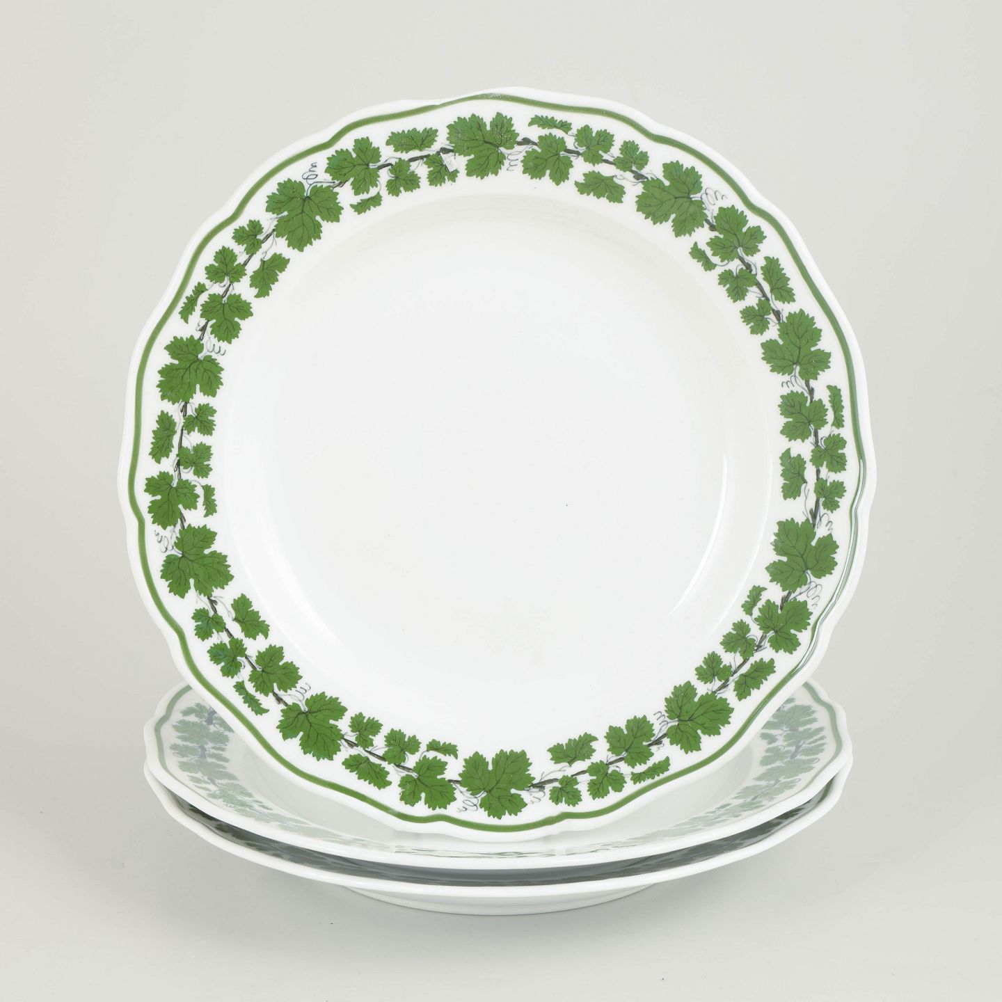 Runde porcelænstallerkener dekoreret med grøn vinløvsbort langs kanten. Nogle eksemplarer annulleret med to indridsede streger, andre med fire indridsede streger. Mærket med Meissens krydsede sværd. Én tallerken med et meget lille og ubetydeligt skår, se foto.