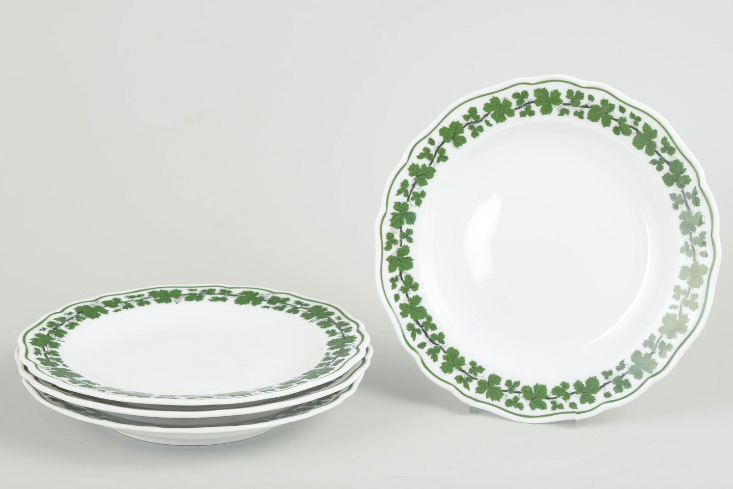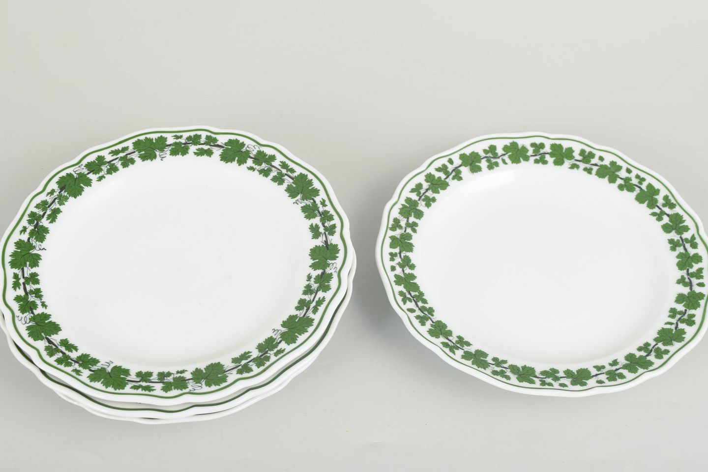Runde porcelænstallerkener dekoreret med grøn vinløvsbort langs kanten. Nogle eksemplarer i første sortering, andre annulleret med fire indridsede streger. Mærket med Meissens krydsede sværd.