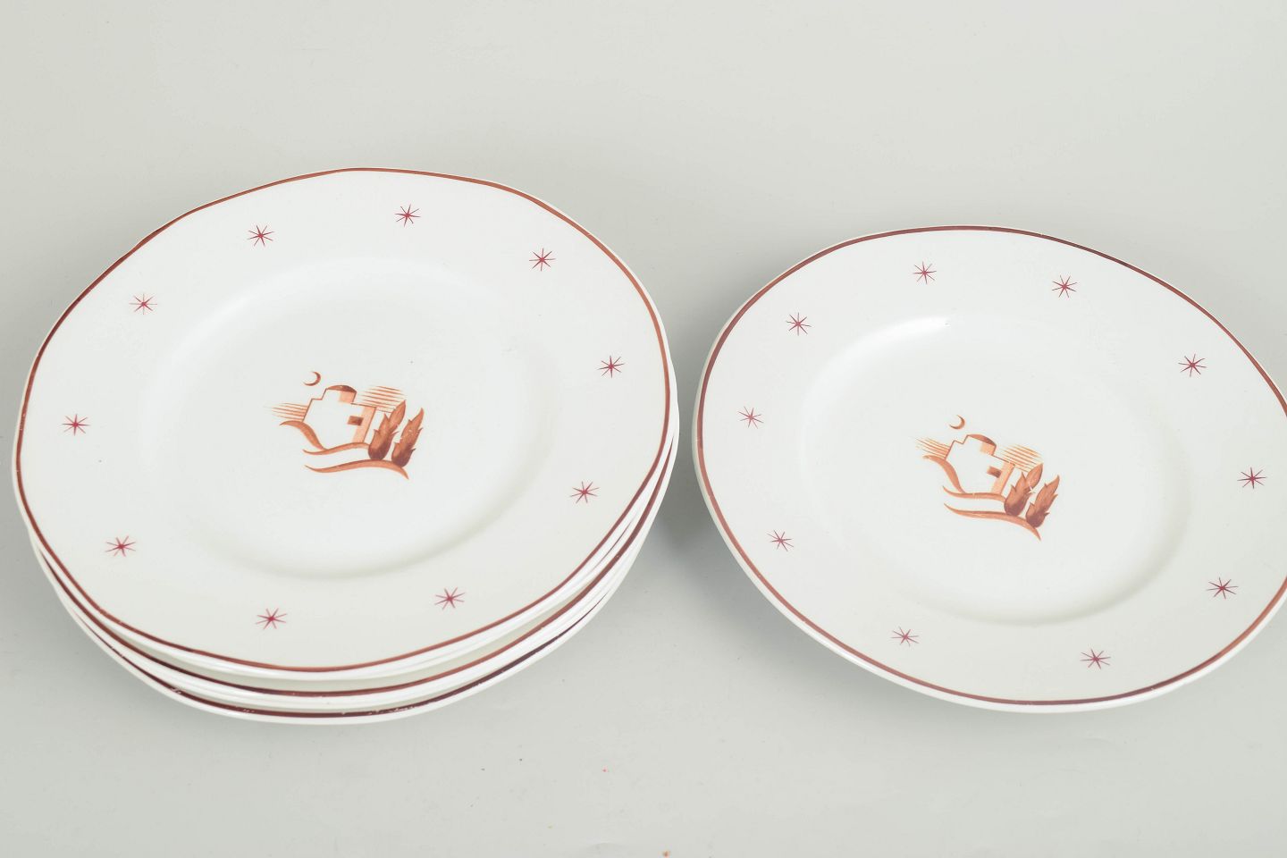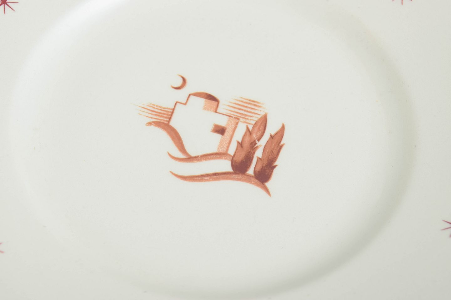 Små tallerkener i glaseret fajance med bølget fane, brun kantstreg og stjernemotiver samt centralt orientalsk landskabsmotiv. Model Orient.