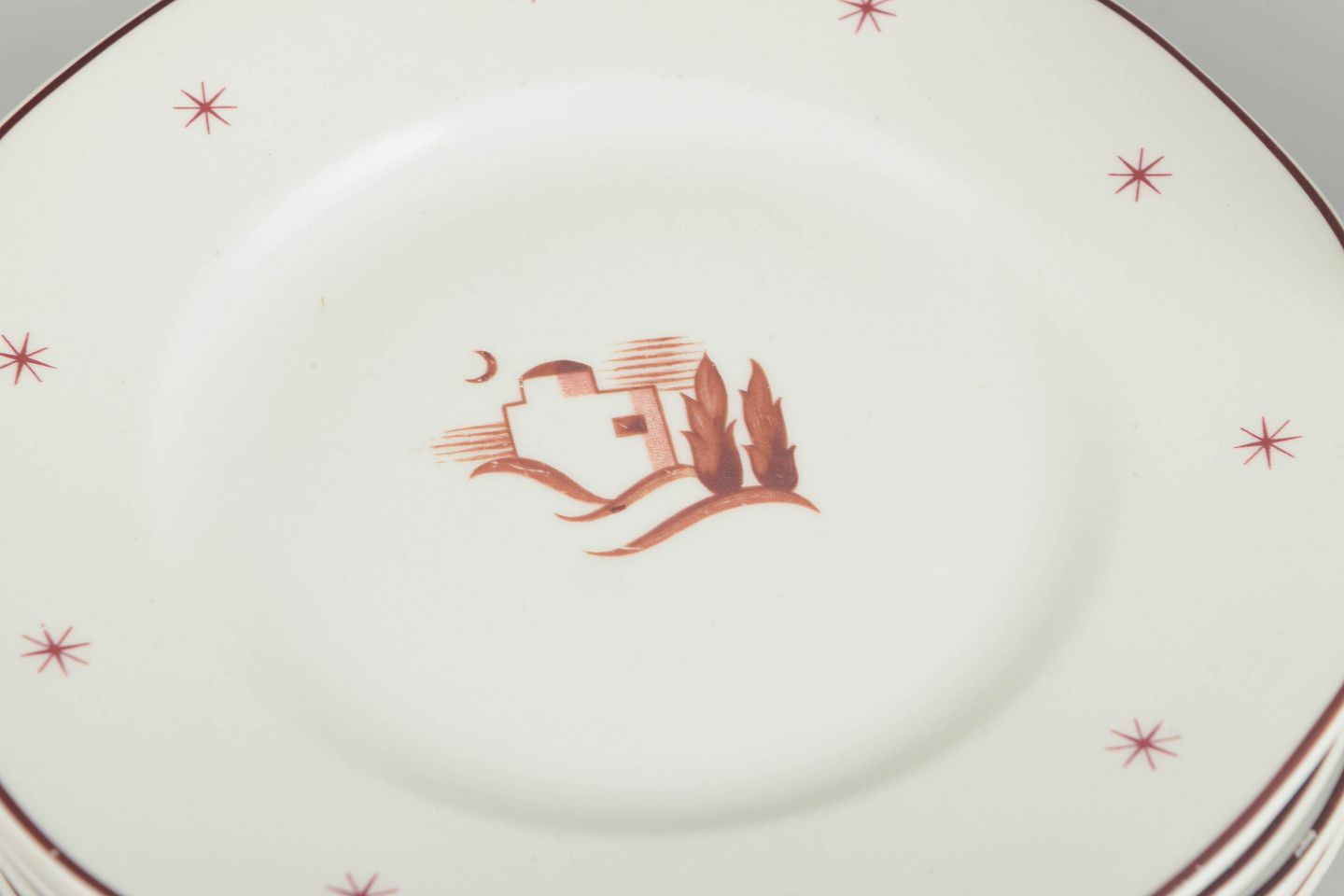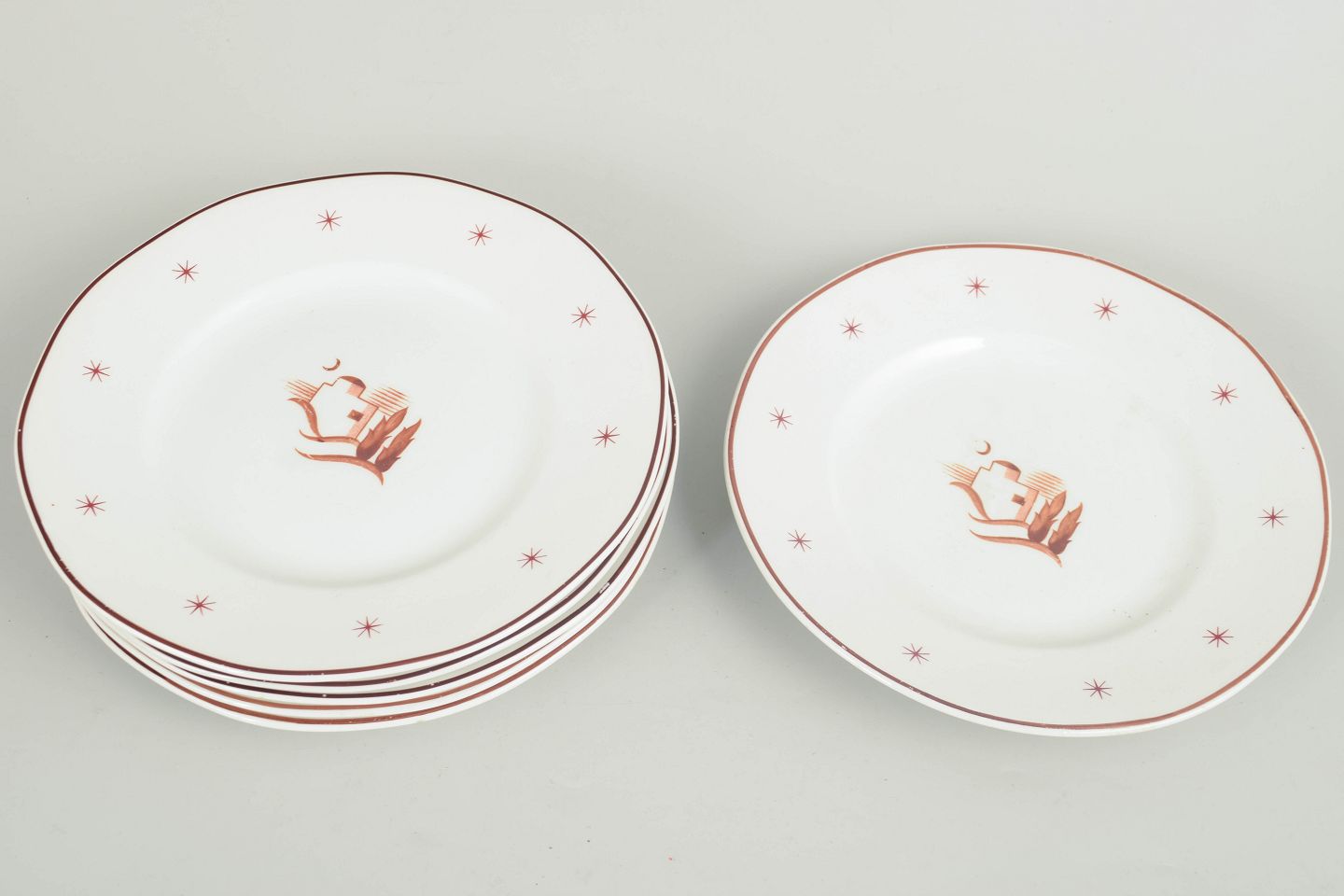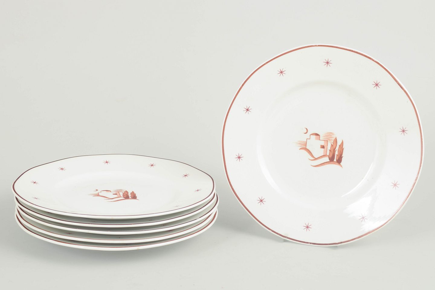 Små tallerkener i glaseret fajance med bølget fane, brun kantstreg og stjernemotiver samt centralt orientalsk landskabsmotiv. Model Orient.