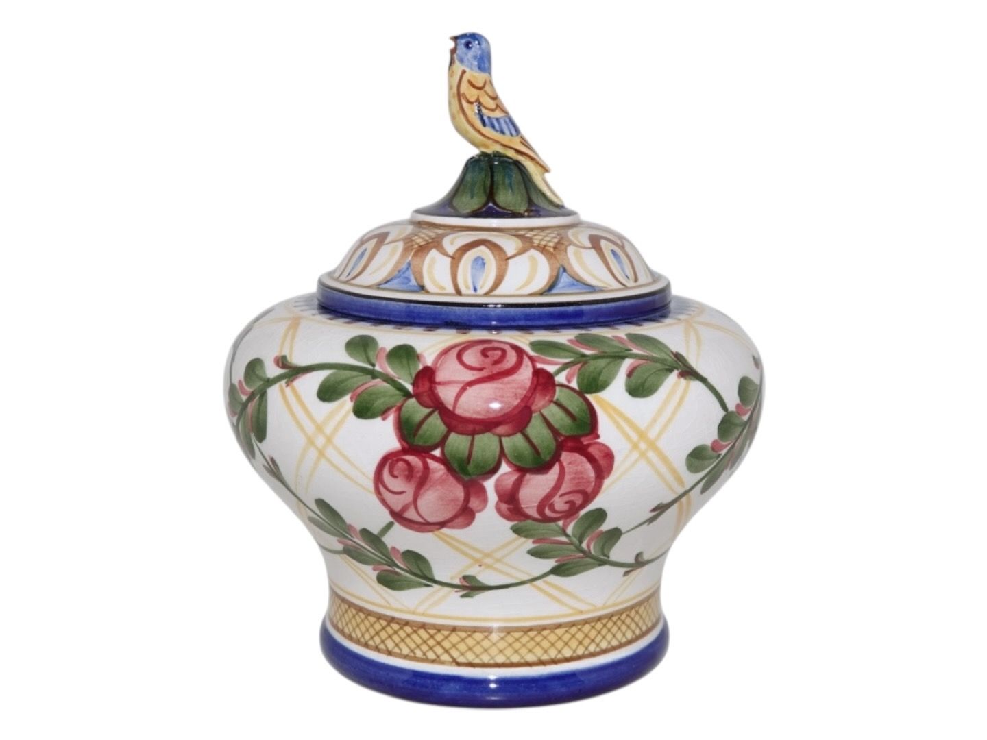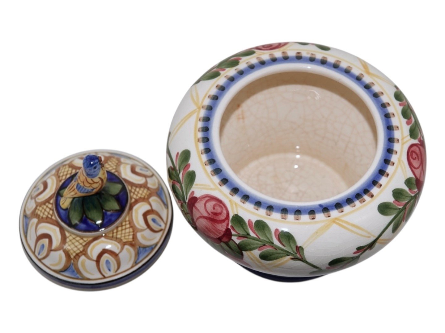 Der er en reparation ved fuglen, som har været knækket af, og der er lidt misfarvninger inden i krukken, se nærfoto, ellers fin stand.
