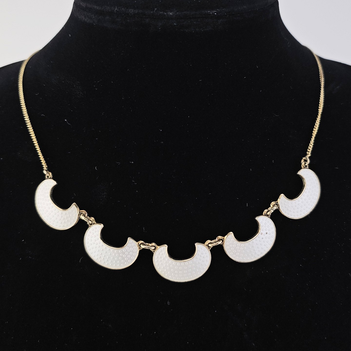 Halskæde i forgyldt sterling sølv med halvmåneformede vedhæng dekoreret med hvid emalje