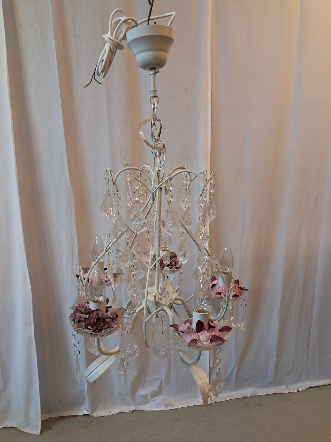 Malet lysekrone i metal med plastprismer, fra 1990erne.