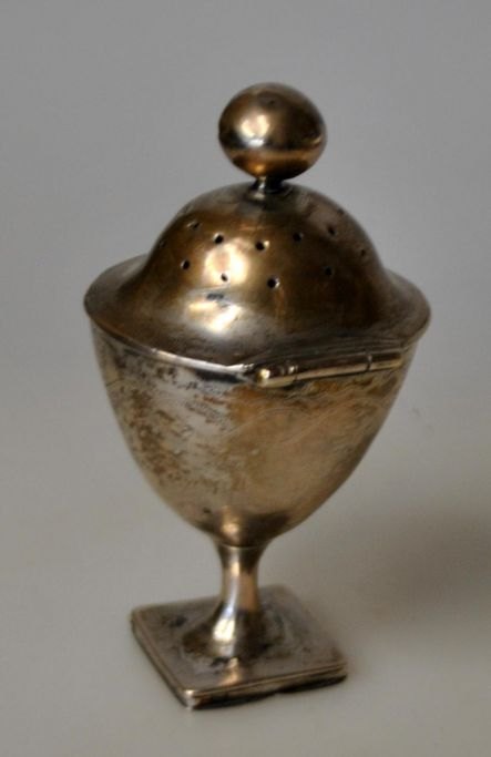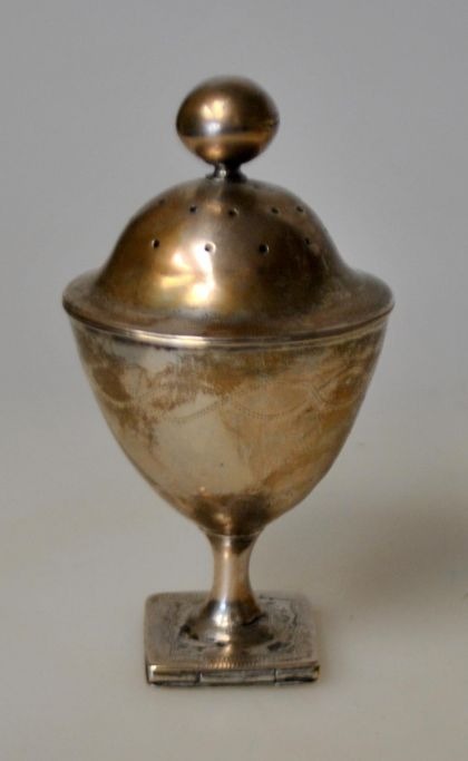 Niels Holst Wendelboe (1763 - 1811) Aarhus, Danmark: Empire hovedvandsæg. 1827. Med dufthuller. Balsamgemme. Indvendig lueforgyldt. Med graveringer. Stemplet i bund. Ligeledes med indgraveringer: N. S. S - M.C. D 1827.