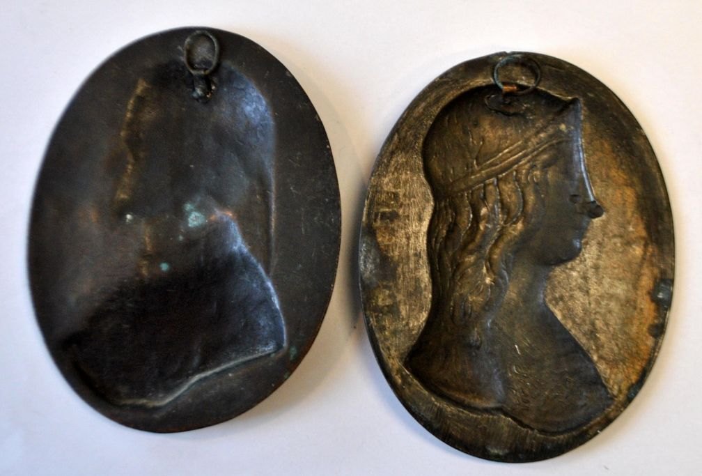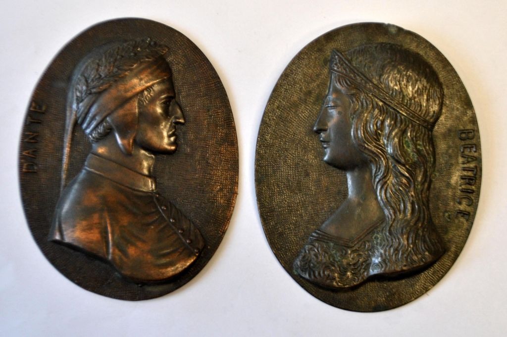 Et par ovale relieffer af Dante og Beatrice, 19. årh. Italien. Metal. 11,5 x 9 cm. Til ophængning.