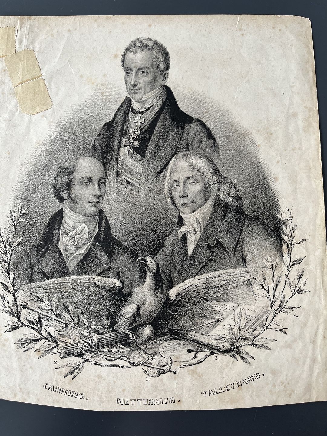 3 europæiske politiker portrætter i kartouche med ørn.