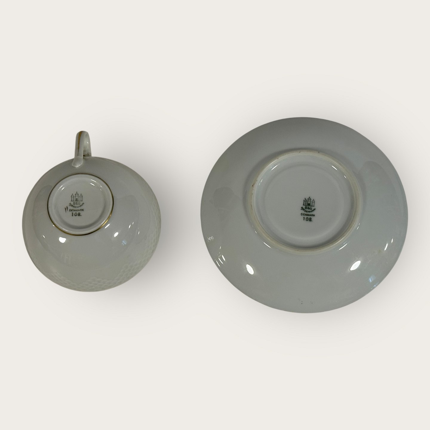 Bing & Grøndahl, Aakjær, Hvid porcelæn med guldkant, Tekop sæt #108, 5cm høj, 10cm i diameter, 1.sortering *Pæn stand*