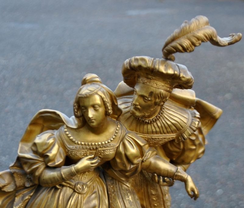 Fransk kaminur i lueforgyldt bronze, 1810 - 1820. Charles X. Uret dekoreret med figurer forestillende en kavaler og en kvinde. Detaljeret kasse. Med hvidemaljeret skive. H.: 70 cm. B.: 39 cm. D.: 14 cm.