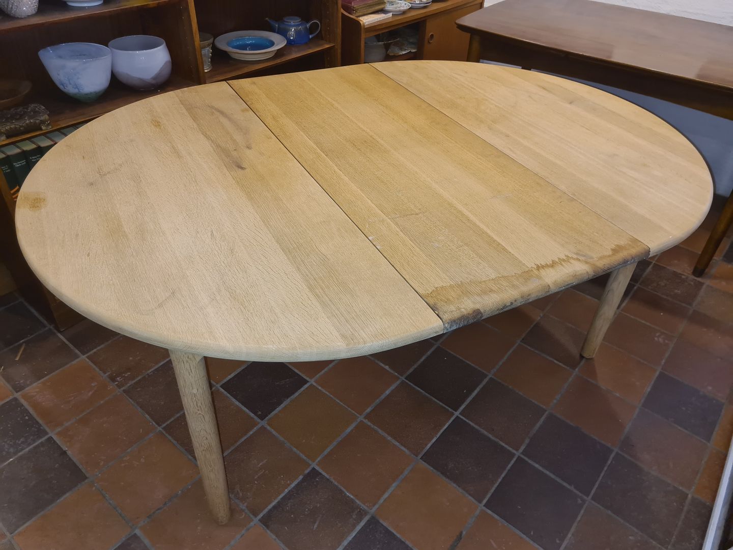 Kurt Østervig rundt spisebord udført i massiv eg samt 1 stk. tillægsplade også massiv eg. Fremstillet hos KP Møbler ca. 1980'erne. Mærket herfra.