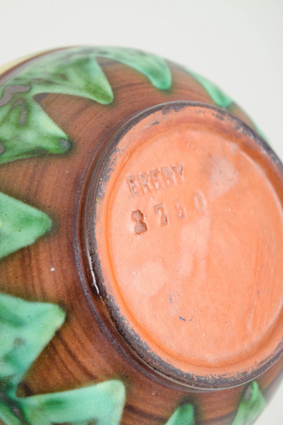 Keramisk vase i stentøj med polykrom glasur i grønne, gule og brune toner, dekoreret med stiliserede blad- og plantemotiver. Modellen er udført med små sidehåndtag og bærer fabriksmærke samt modelnummer 2750 i bunden.